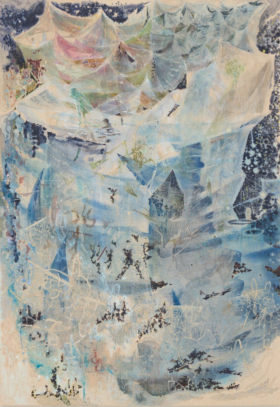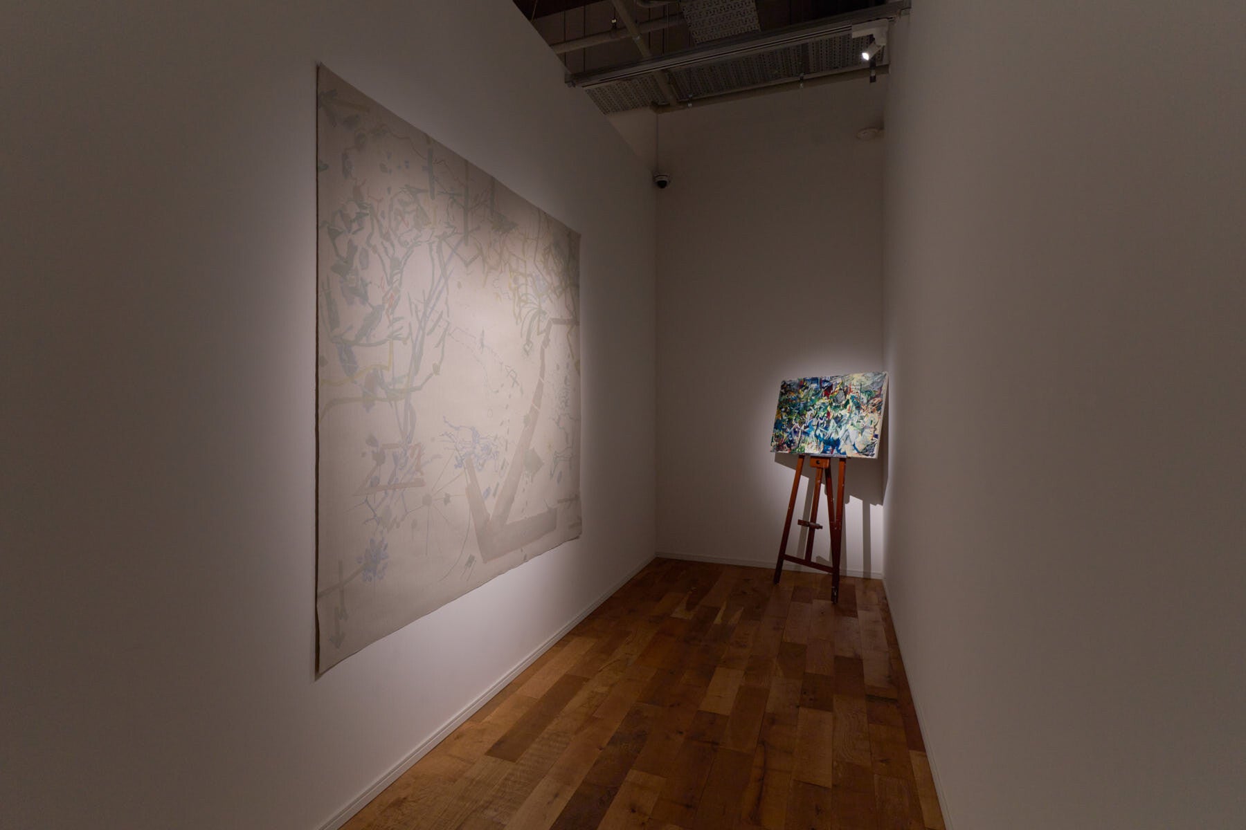展覧会タイトル「Fishing as a Mole Does – Until Stone Becomes Water –『もぐらのように釣りをする – 石が水になるまで –』」は、上田の制作プロセスを象徴的に表しています。視覚に頼らず土を掘り進むもぐらのように、あらかじめ「何をどう描くか」を決めずに描き始める姿勢。そして、静かに待ちながらも見えないものを捉えようとする「釣り」は、彼女の制作態度を示すメタファーです。副題の「石が水になるまで」は、物質の流動性や変容の可能性を示唆し、地質学的な時間のスケールを想起させます。