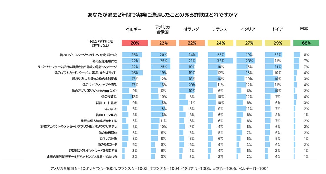 過去2年間に詐欺に遭遇したと回答した日本のインターネットユーザーは32%で、68%は詐欺に遭遇していないと回答しました。詐欺に遭遇したと回答した人の中で最も多かった手口が偽ウェブサイトのリンクへのアクセス、配達詐欺、偽のサポートセンターからのフィッシングでした。