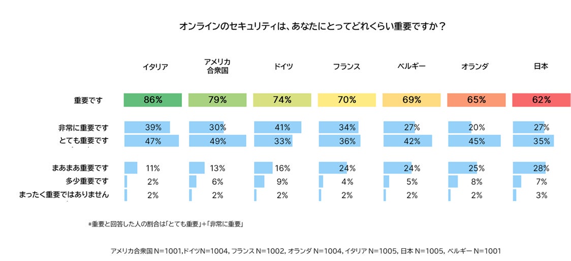 オンラインセキュリティに対する認識についても、同様の傾向が見られます。イタリアの回答者の86%が「オンラインセキュリティは非常に重要である」と考えているのに対し、日本の回答者では62%と、認識が低い傾向にあることが分かります。