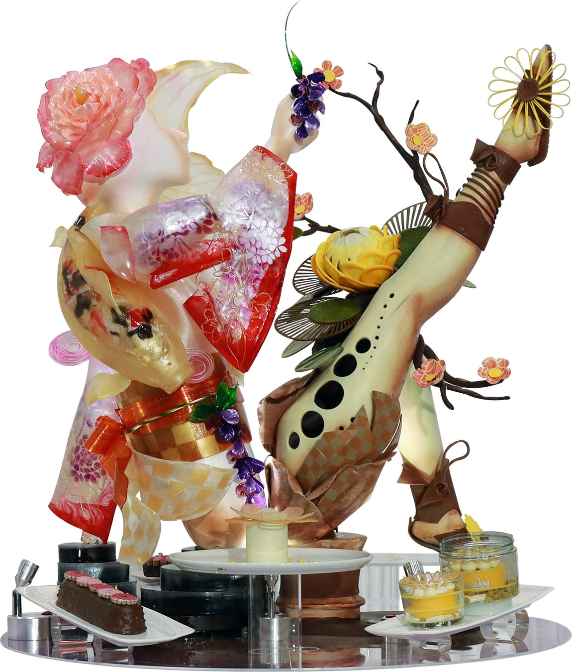 アジア大陸予選のテーマ「feminine fashion -spring/summer(フェミニンファッション -春夏-)」のもと、競技規則の高さ100センチを最大限に利用し、女性の座り姿勢をアメとチョコレートを融合したスタイルで制作された日本チームの作品。飴細工で制作したモダンな花柄の着物の女性が、チョコレート細工で制作した革細工のサンダルを装っています。春夏らしい花を添えてフェミニンさを加えました。