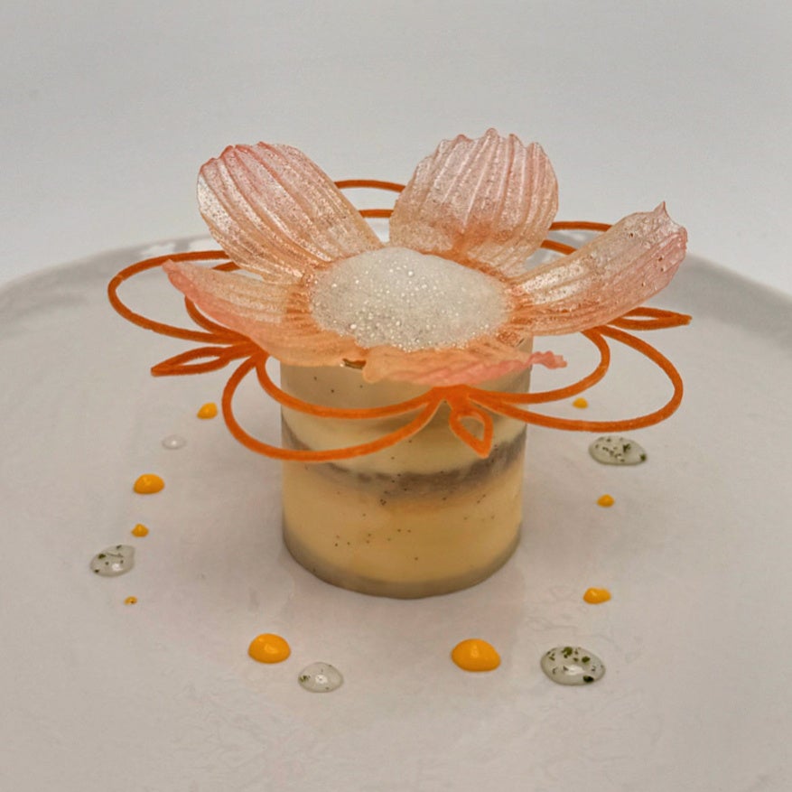 初夏の軽やかさとそよ風をイメージし、ココナッツ主体にパッションフルーツとパイナップルの酸味を加え、チョコレートの薄い器で軽やかさを演出。繊細なシガレットやオパリーヌを使い、可愛らしいお花のデザインと立体感で視覚的にも楽しめる仕上がりになっています。