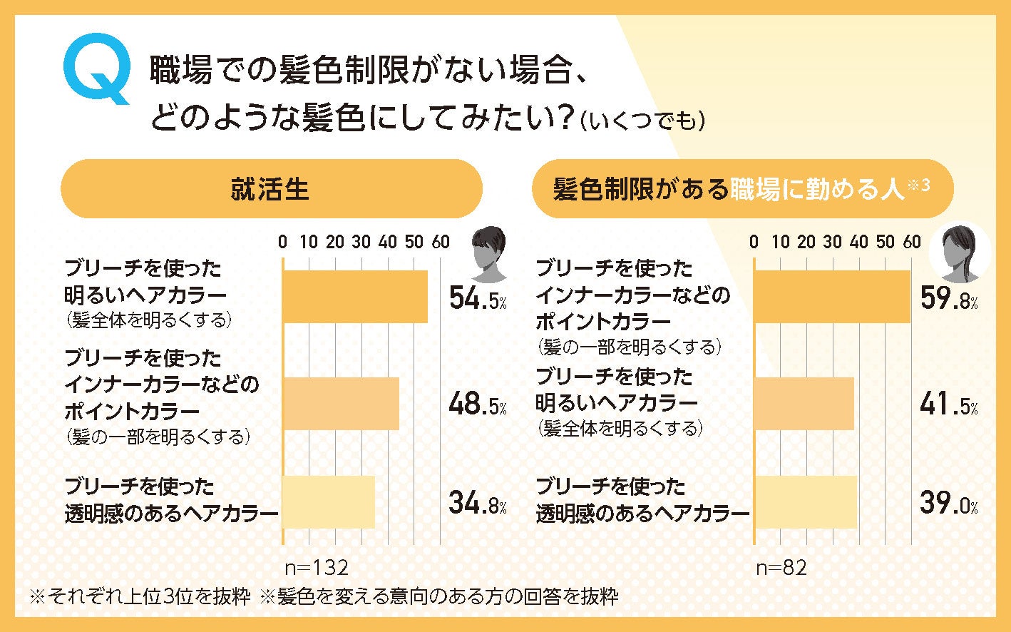 本調査では、髪色を変えたいと考えている人においては、会社員と就活生のいずれにおいてもブリーチを使ったヘアカラーが人気であることがわかりました。就活生ではポイントカラーではなく、髪全体を明るくするヘアカラーが1位となったことから、髪色に寛容な職場を求める傾向は今後も続くものと考えられます。