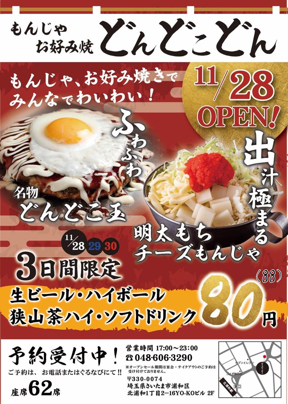 株式会社ミナモト(所在地:埼玉県入間市/代表:細田源太)と、埼玉県内で15店舗を展開する株式会社ロット(所在地:埼玉県戸田市/代表:山﨑将志)が共同開発した新ブランド 「もんじゃ お好み焼 どんどこどん 北浦和店」が、2025年11月28日(金)にオープンいたします。