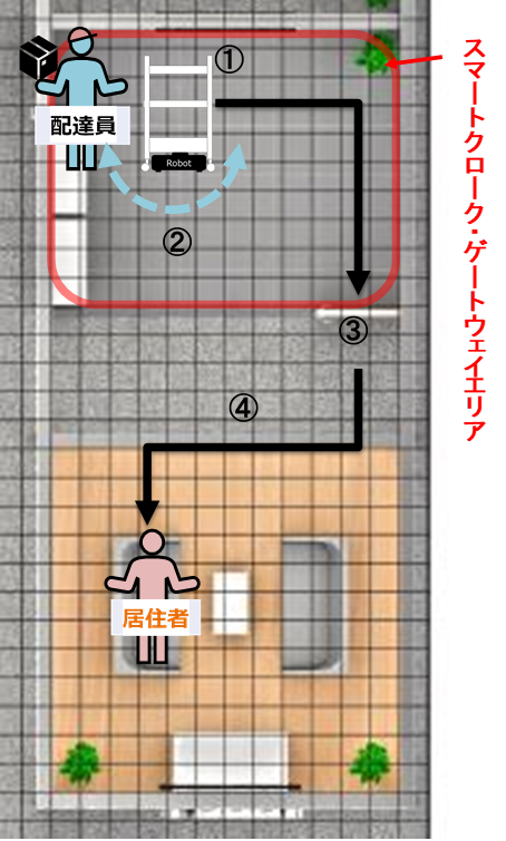 ②配達員が進入した場合、自律移動ロボットが回転して追尾し、警告を発信「出口へお戻りください!」