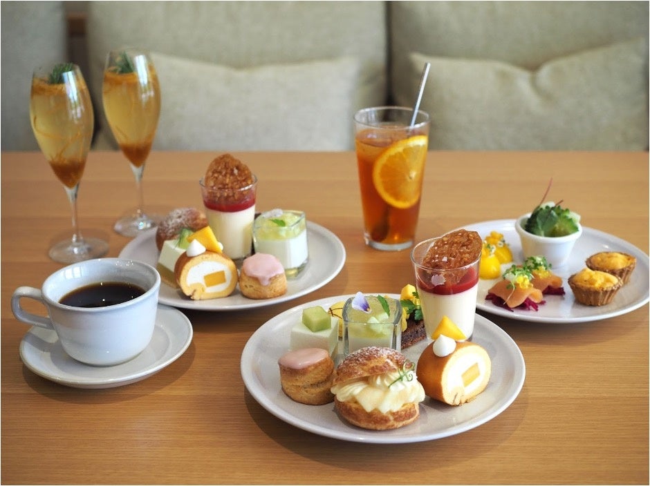 桃やメロンなどの旬の夏果実がたっぷり!ハーブやスパイスを合わせた、全12種の自家製スイーツとセイボリーが彩ります