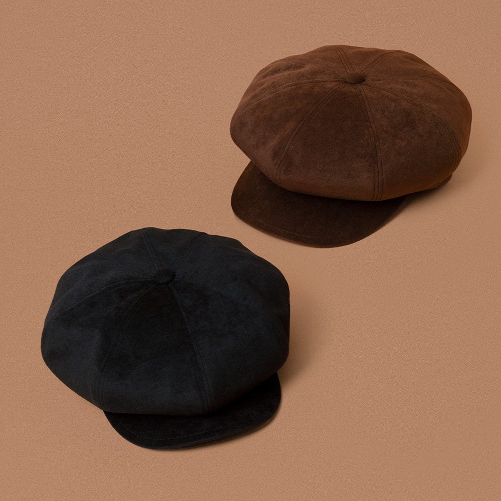 しっとりとしたフェイクスウェードで仕立てたキャスケット。クラウンにボリュームを持たせたシルエットが特徴で、ハンチングやベレーの様にアレンジしてかぶることもできます。