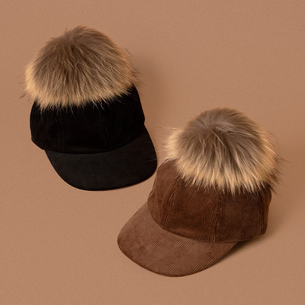 ジョッキーキャップをモチーフにした8パネルキャップ。コーデュロイのボディに毛足の長いポンポンをあしらい、上品で温もりのあるアイテムに仕上げています。ポンポンは取り外しもできるので、シンプルなキャップとしてもお使いいただけます。