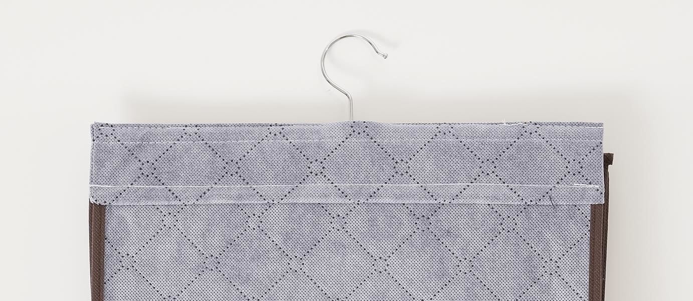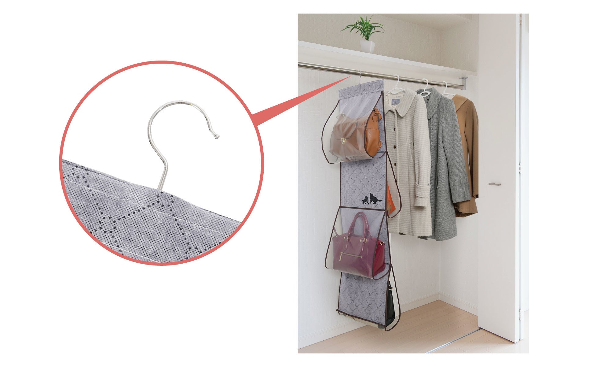 フック式なので、クローゼットや衣装ラックに吊り下げられ、デッドスペースを有効に活用できます。