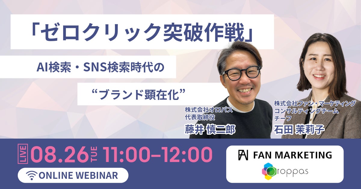 SEOツール「パスカル」の開発・提供を行う株式会社オロパスは、2025年8月26日(火)に「ゼロクリック突破作戦」AI検索・SNS検索時代の”ブランド顕在化”をテーマに株式会社ファン・マーケティングと共催ウェビナーを開催いたします。