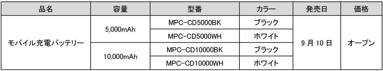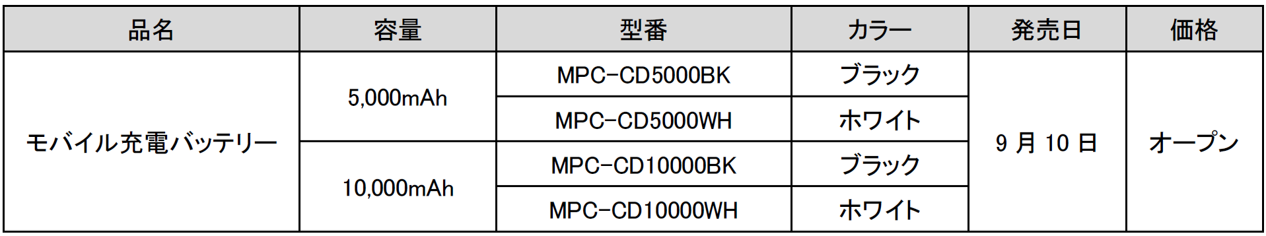 マクセル株式会社(取締役社長:中村 啓次/以下、マクセル)は、9月1日の防災の日にあわせて、コンパクトサイズかつ3種のコネクターに対応したモバイル充電バッテリー2機種を9月10日より発売します。約105gと軽量コンパクトサイズで容量5,000mAhの「MPC-CD5000」、ワイヤレスヘッドホンなど低電流機器の充電にも対応可能な容量10,000mAhの「MPC-CD10000」です。