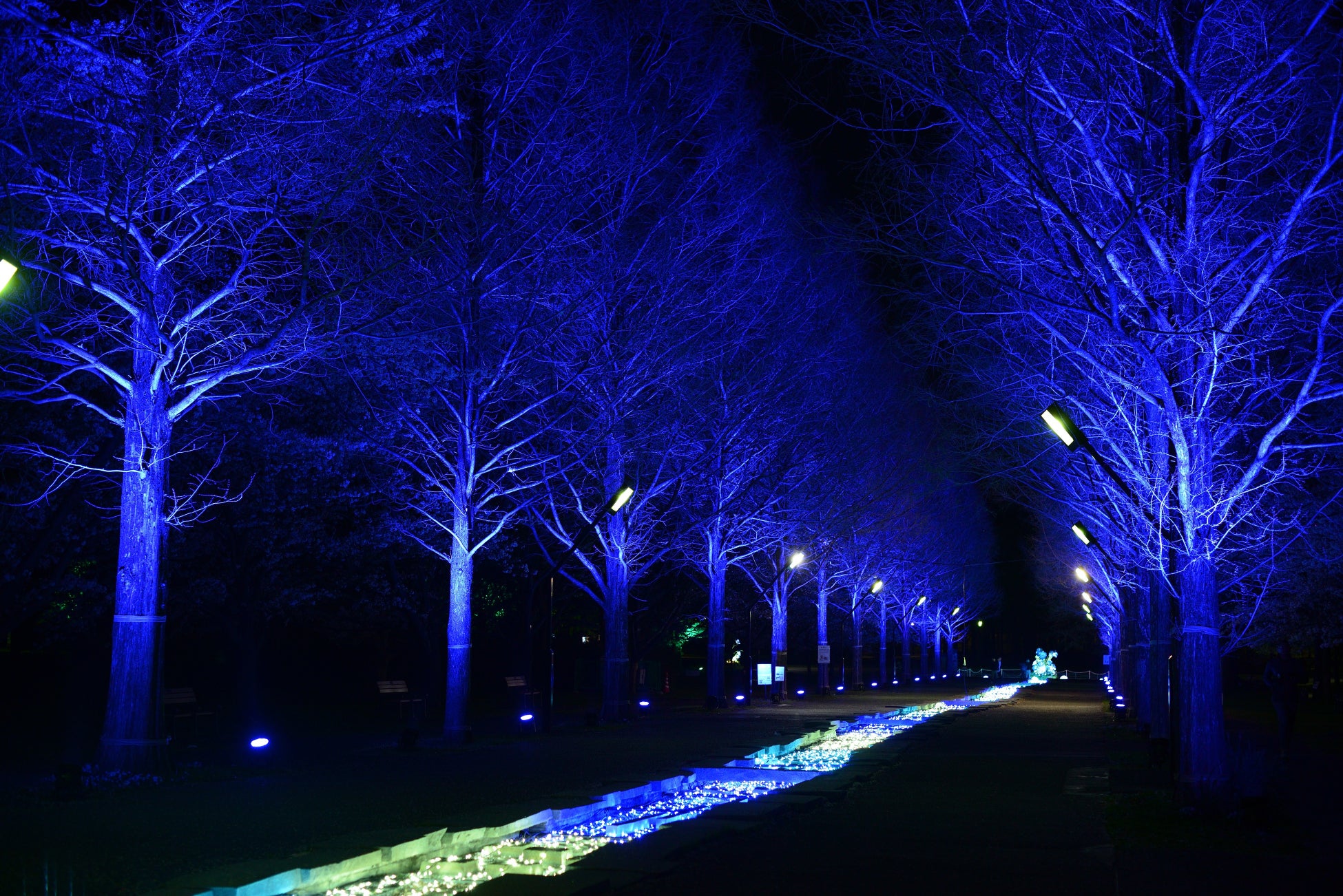 噴水から立ち並ぶメタセコイアの樹木は、ネモフィラの和名「瑠璃唐草(るりからくさ)」にちなみ、青に紫を重ねた瑠璃色の幻想的なライトアップで演出。舎人公園が「水と緑のネットワーク拠点」であることを皆様にも感じていただけるよう、並木の間は青や緑のグラデーションカラーと細やかに光り輝く調光によって、流水を表現しました。