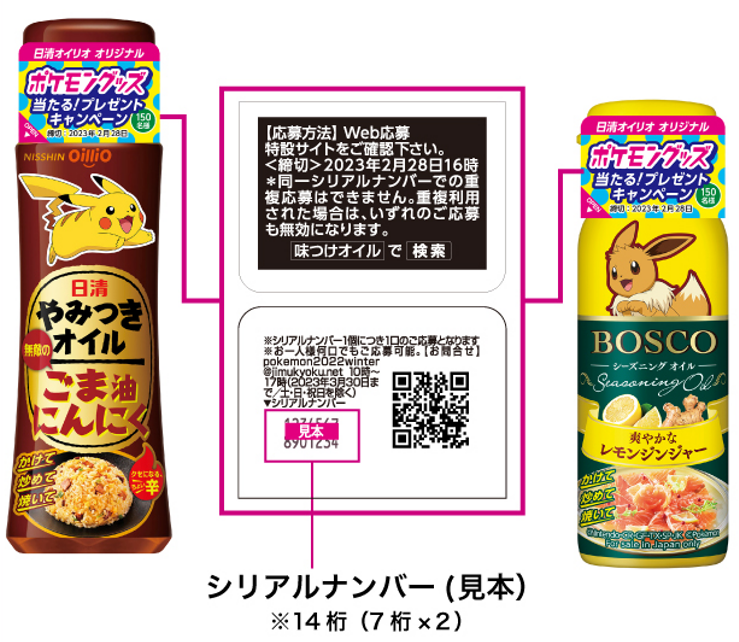 期間限定で発売中の「日清やみつきオイル」または「BOSCOシーズニングオイル」の「ポケモンのデザインボトル」(キャンペーン告知シールが貼付されたものに限る)を購入して、ご応募いただいた方の中から抽選で150名様に、当社オリジナルのラバーコースター4枚セットをプレゼントいたします。「ポケモンのデザインボトル」は、今夏発売しご好評をいただいた6商品に加え、新商品2品(「日清やみつきオイル」 海老ラー油、「BOSCOシーズニングオイル」レッドペッパー)が加わり全8商品で展開中です。