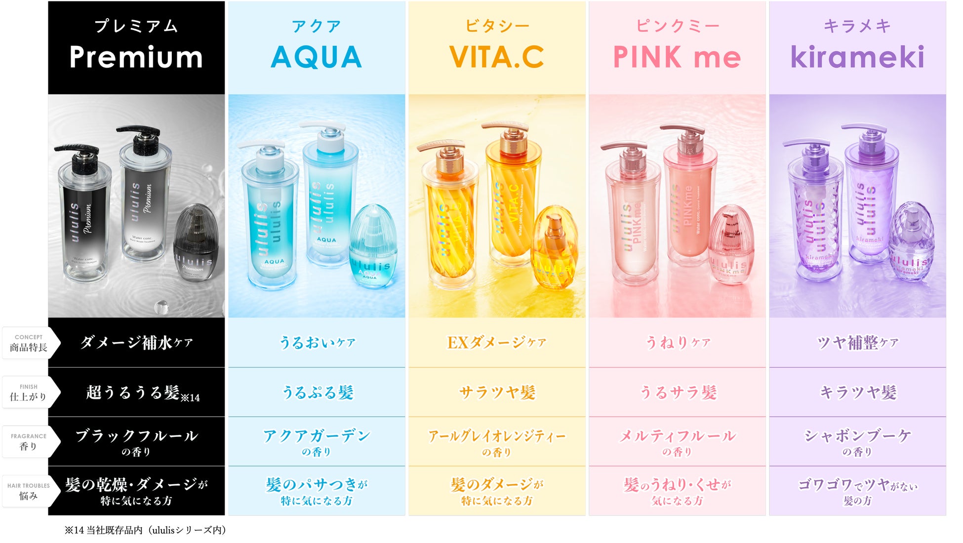 うるおいケアの「AQUA(アクア)」、EXダメージケアの「VITA.C(ビタシー)」、うねりケアの「PINKme(ピンクミー)」、ツヤ補整ケアの「kirameki(キラメキ)」、ダメージ補水ケアの「Premium(プレミアム)」の5シリーズ展開。