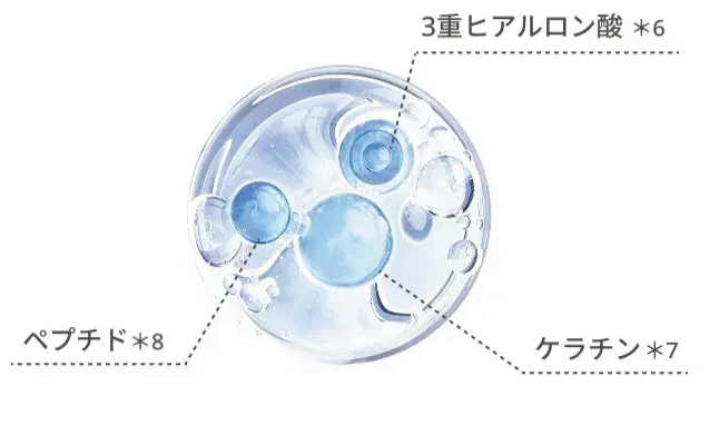 ●3重ヒアルロン酸*6:異なる3種の分子サイズを組み合わせることで浸透力を高めながら※6、うるおいを底上げします。