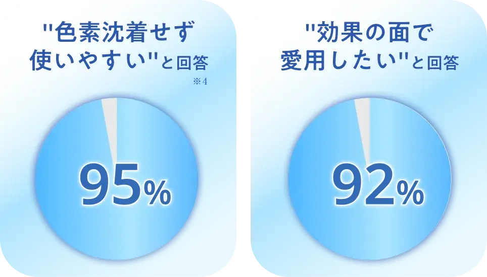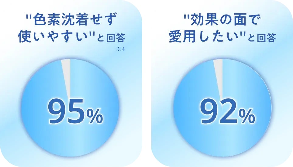 まつ毛美容液ユーザー100名を対象にしたモニター調査では、「色素沈着せず使いやすい※4」と回答した方が95%、さらに「効果の面で愛用したい」と回答した方が92%にのぼりました。