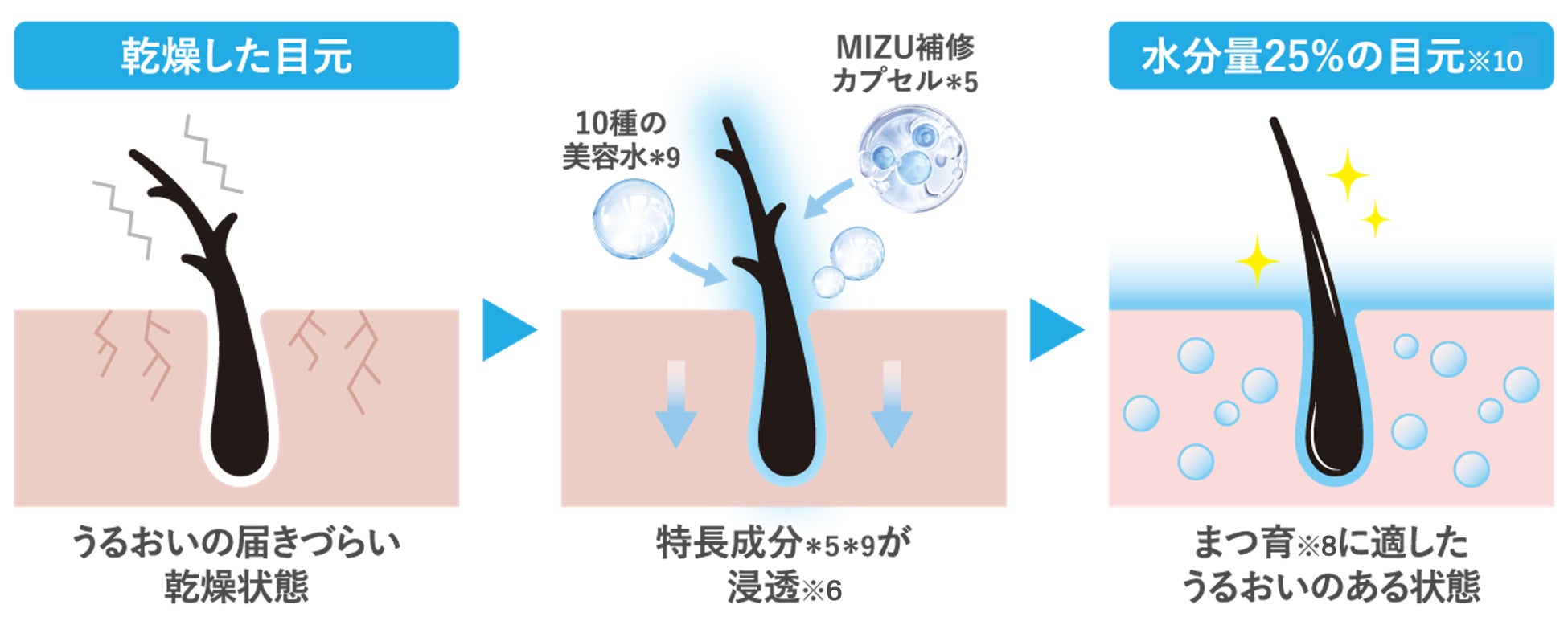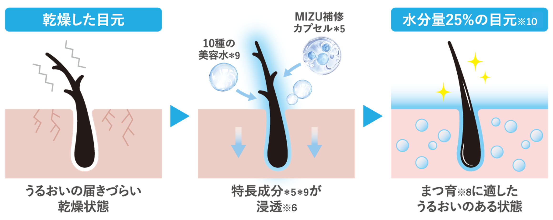 独自処方の「MIZU補修カプセル*5」を配合。3重ヒアルロン酸*6・ケラチン*7・ペプチド*8をリポソーム化することで、ダメージが気になるまつ毛を集中補修し、みずみずしくハリ・コシのある印象へと導きます。