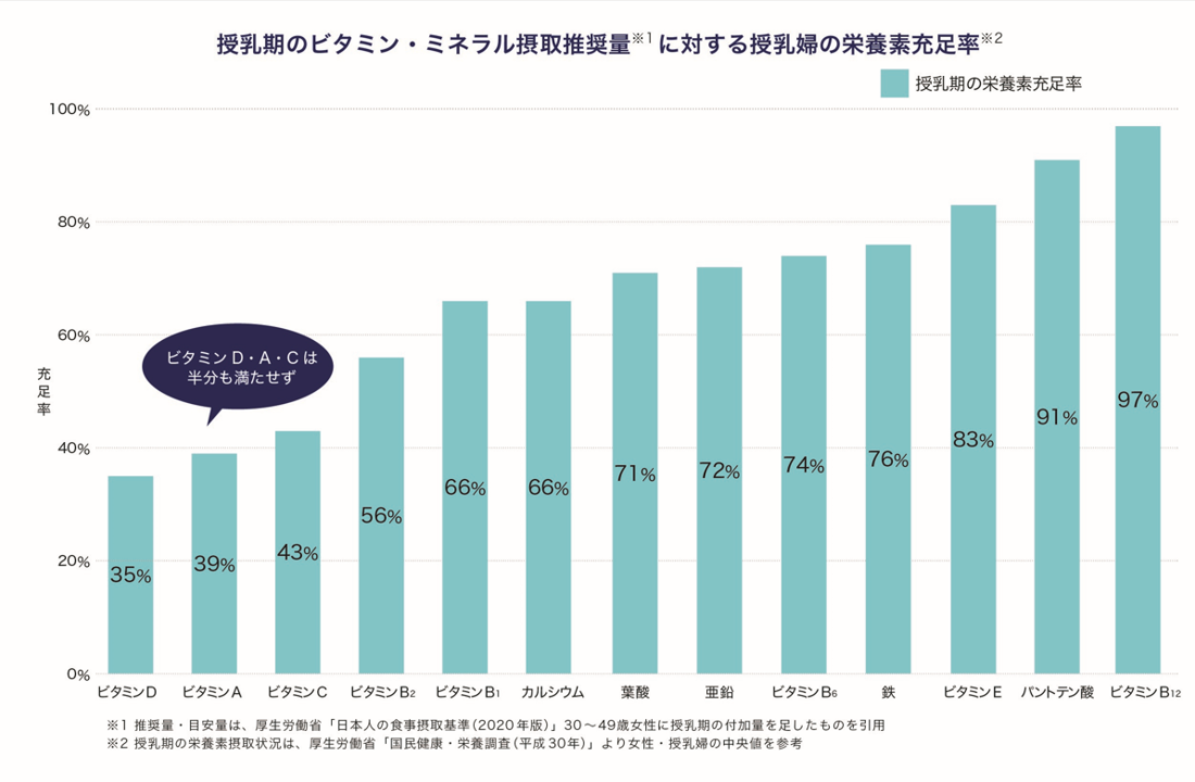 「エレビット® 産後ケア」は1日3粒で、多くのママが毎日の食事からでは摂りきれない、授乳期に必要な栄養を補填し、厚生労働省の授乳期推奨量をカバーするよう設計しています。多くの授乳期の女性では、栄養素の摂取量が不足しているといわれており、特にビタミンD・A・Cは、推奨量・目安量の半分に満たない状況です。