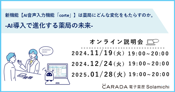 【無料オンライン説明会】クラウド電子薬歴『CARADA 電子薬歴 Solamichi』の新機能“AI音声入力機能「corte」”のオンライン説明会を開催!第1回は11月19日(火)19時より実施