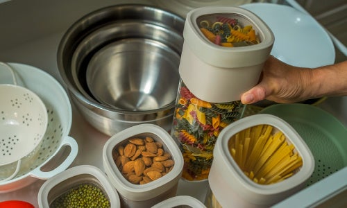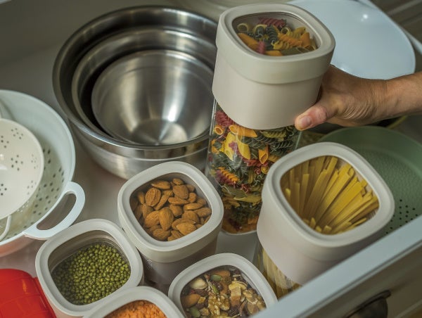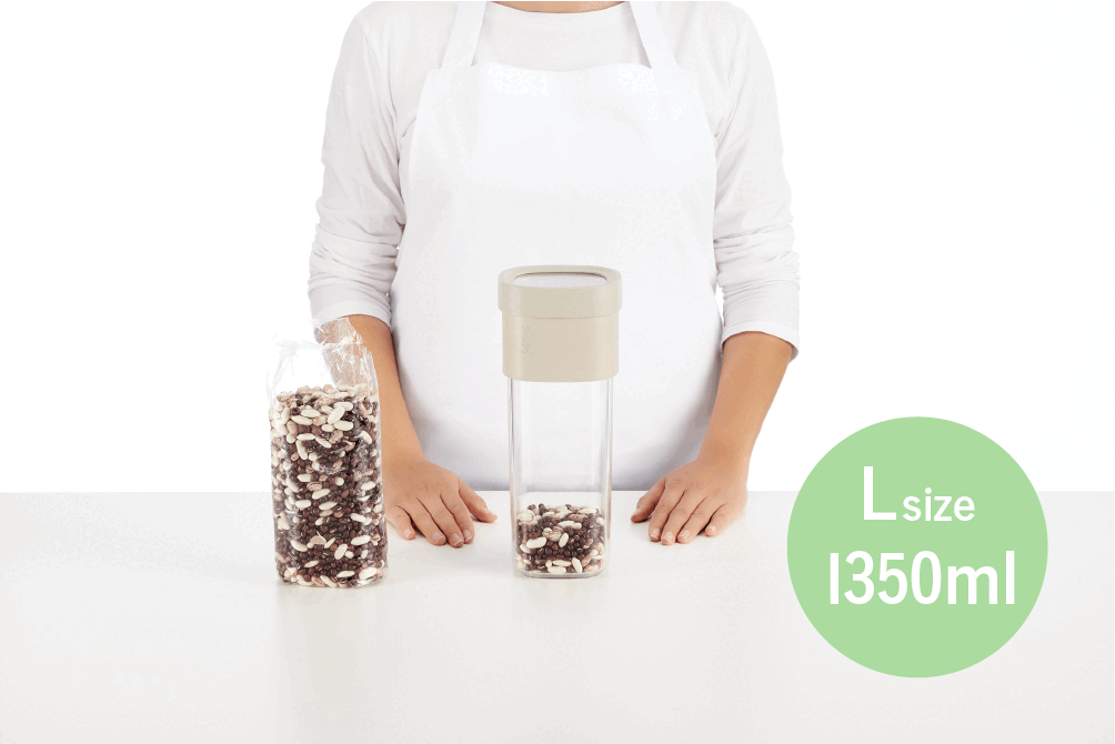 1つで2つのサイズを使えるので、パスタやシリアル、小麦粉やナッツ類など様々な食材に合わせて、ちょうどいいサイズで使えます。