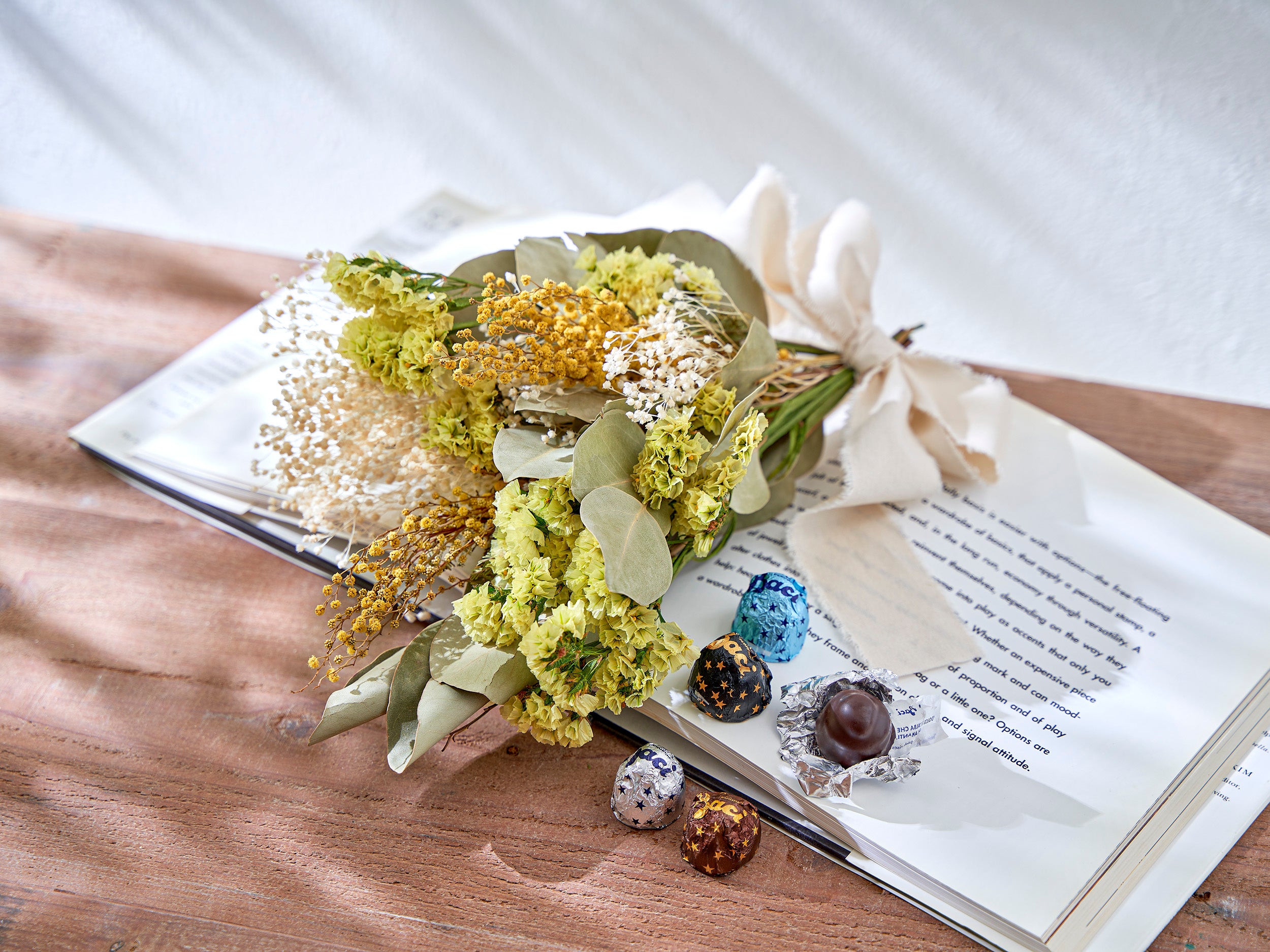 当選者の10名様にはバッチのチョコレートと日比谷花壇プロデュースのミモザを使ったドライスワッグをセットにしてお届けする予定です。
