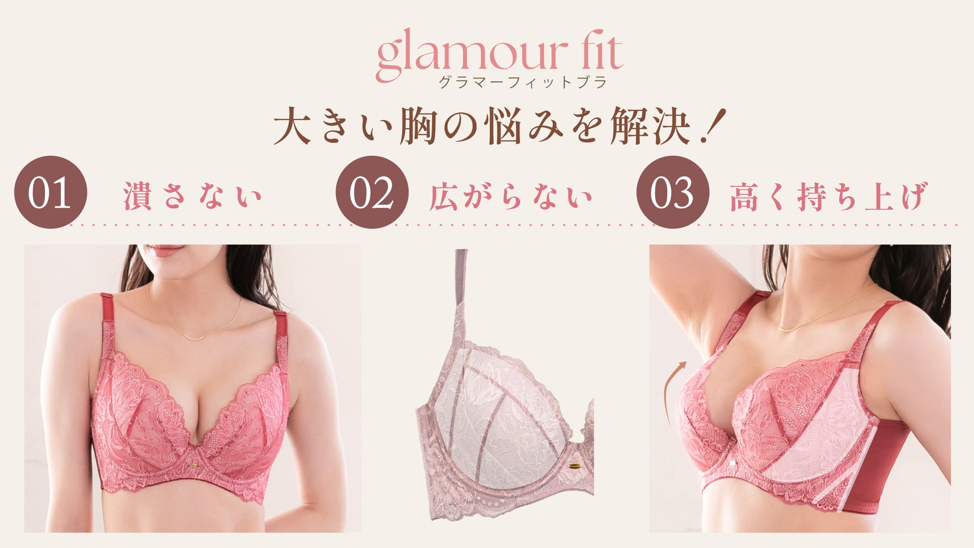 日本人のブラジャーのカップサイズは多様化しており、ライフスタイルや食生活の変化、健康意識の高まりなどによって、大きな胸の割合が増えていると言われています。しかし、Fカップ以上の比率はまだ少なく、自分に合う下着を見つけることも難しいのが現状です。さらに、バストが大きいと「横に広がり太って見える」「肩が凝る」「下垂が気になる」などの身体的な悩みも多く、バストが大きいことで周囲の視線が気になり、自分の体型に自信を持てないことがあります。そんな悩みを解決して、ありのままの“自胸”を好きになれるよう開発されたのが「グラマーフィットブラ」です。