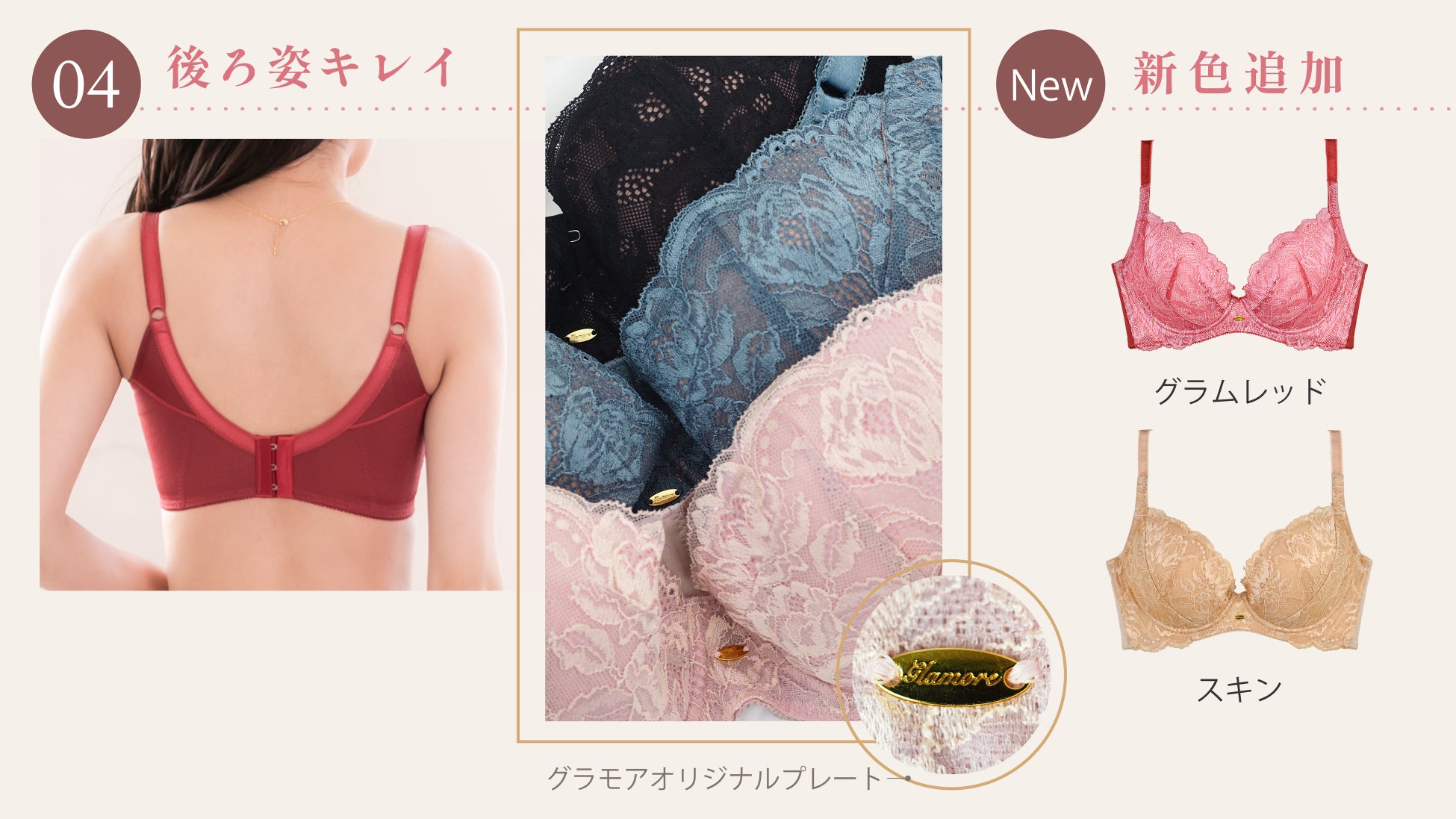 悩める“ブラ難民”に選ばれて、シリーズ販売累計123万枚を突破した「グラモアブラ」の進化版。大きな胸に特化した設計の補正ブラ。
