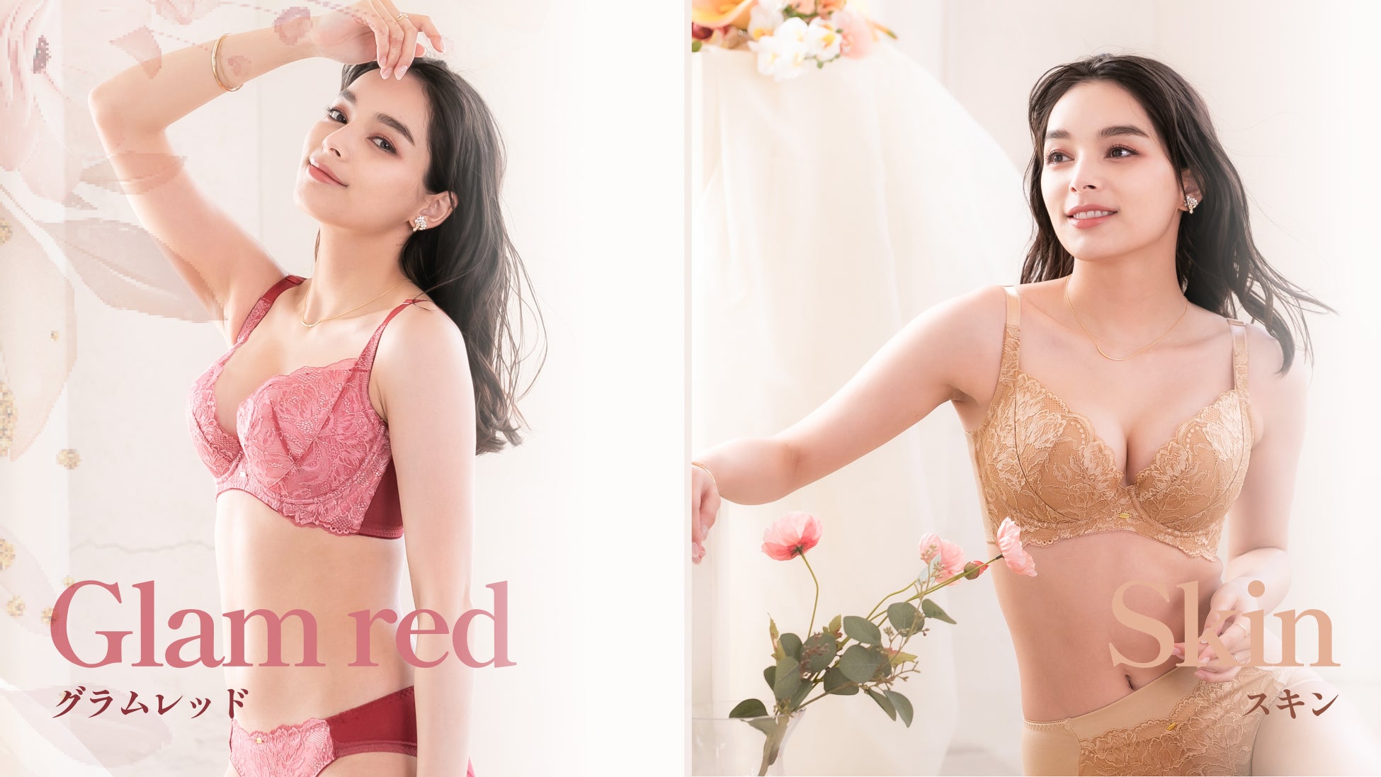 新色は透けにくいベージュ系の「スキン」と肌馴染みも良く特別な日に纏いたくなるような深みのあるレッド系「グラムレッド」の2色。ブラとセットでコーディネートを楽しみながら、バストだけでなく全身を魅力的に演出します。