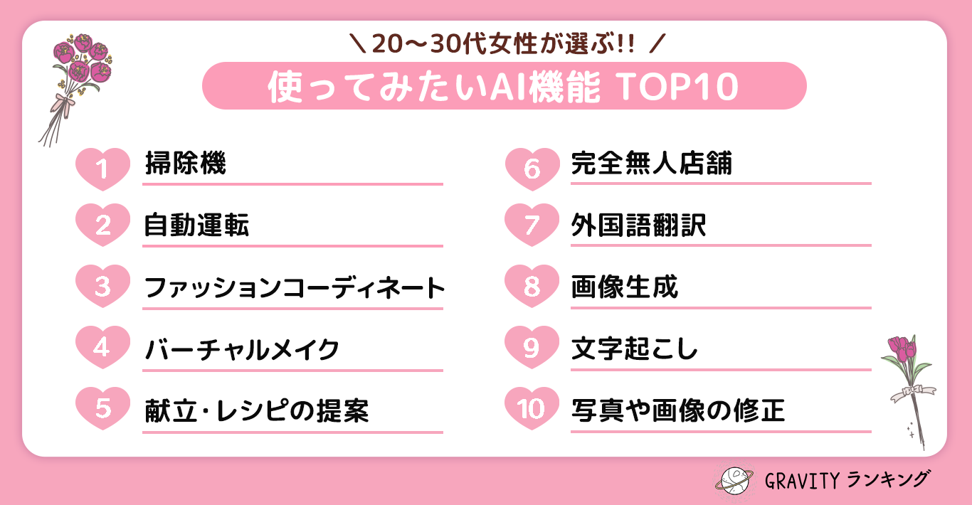 【GRAVITYランキング】20代〜30代女性が選ぶ!!「使ってみたいAI機能TOP10」