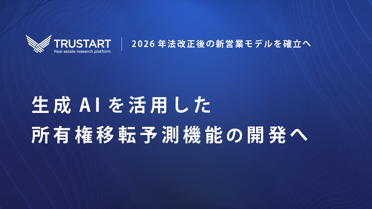 AI×不動産ビッグデータで不動産関連業務のDXを伴走支援するプラットフォーム「R.E.DATA (リデータ)」を開発・提供するTRUSTART株式会社(本社:東京都港区、代表取締役:大江洋治郎、読み:トラスタート、以下「TRUSTART」)は、2026年10月に施行される不動産登記規則等の一部改正に伴う「重要度の高い営業情報源の途絶」という業界課題を解決するため、生成AIを活用し「所有権移転予測機能」の開発を決定しました。これにより、法改正後の「仕入れ」戦略をデータで支える次世代営業モデルの確立を支援します。