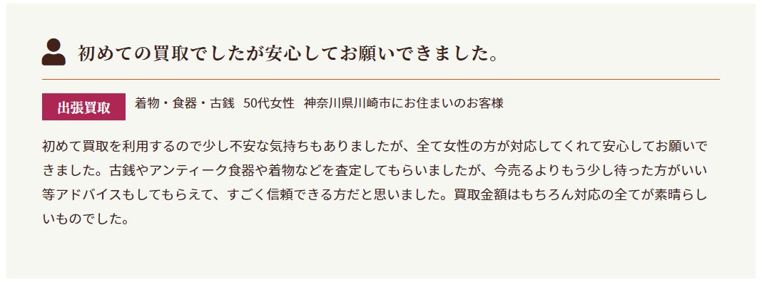 | ・家に一人なので、男性が自宅に来るのはちょっと不安… ・買取に出すか決めきれていない物を男性に触られるのは抵抗がある… ・女性同士だったら安心して相談できるのに… |