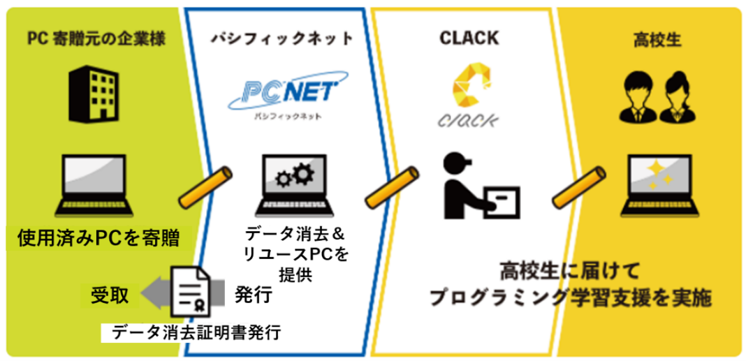 企業から使用済PCを譲り受け、経済的事情を抱える高校生に再生PCを届けてITを学んでもらうプロジェクトです。当社にて情報漏えいを防ぐデータ消去、クリーニング、OS等の再インストールを行って再生PCとして製品化し、これをCLACKが対象の高校生に無償でお届けしています。