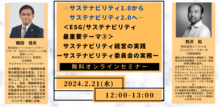 【2/21開催/参加無料】ーサステナビリティ1.0からサステナビリティ2.0へーESG/サステナビリティ最重要テーマ「サステナビリティ経営の実践ーサステナビリティ委員会の実務ー」のセミナーを開催!