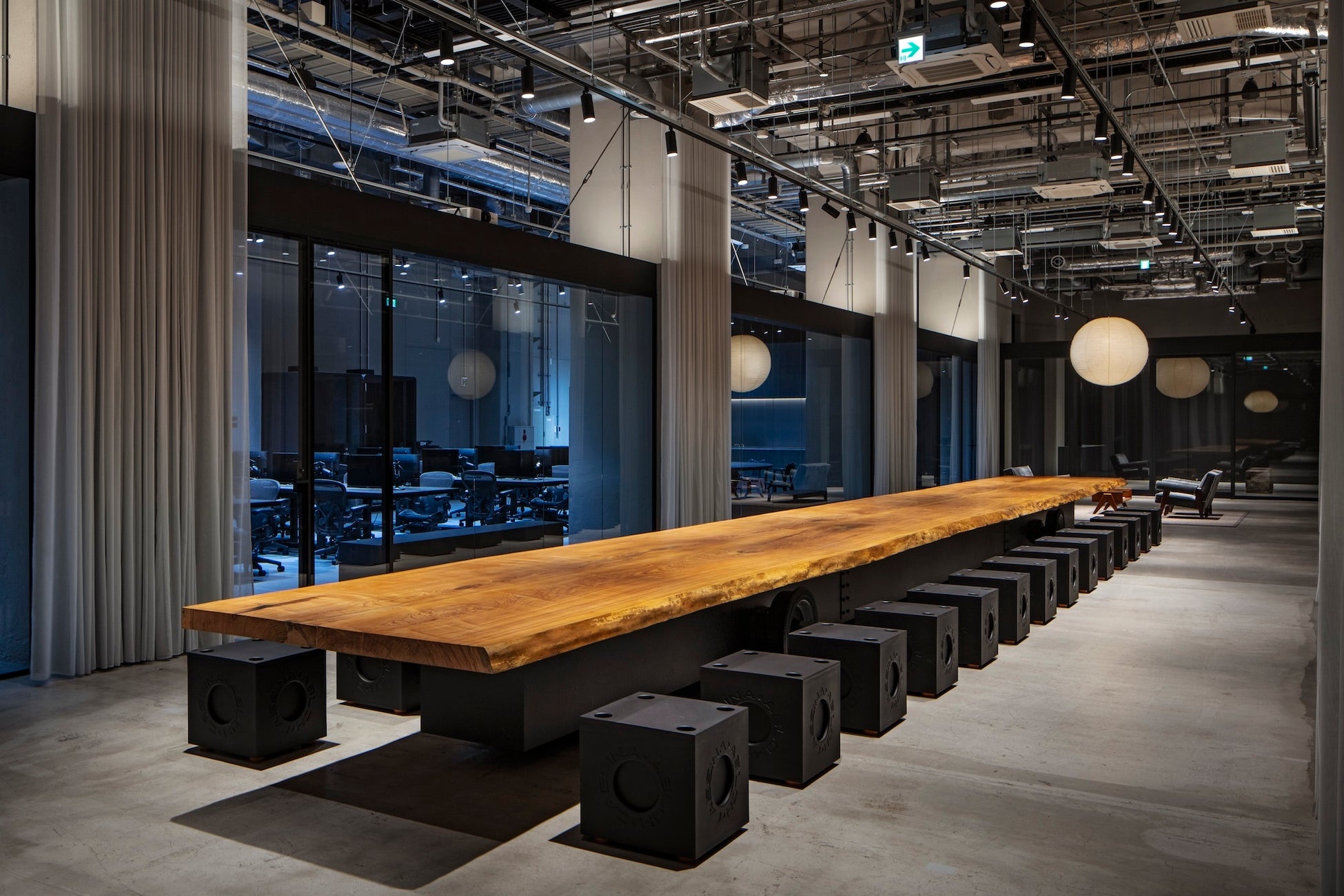 全長15mのビッグテーブルを中心に据えたラウンジスペースです。執務スペースとしての利用に加え、イベント開催も可能な、奥行き40mの大空間となっています。この共通スペースは、会議や交流のための場所としてデザインされており、社内外のイベントや偶発的なコミュニケーションが生まれる開かれた場として、多様な人とアイデアが交差します。テーブルの左右に並ぶスツールはヴァージル・アブローによるデザインです。