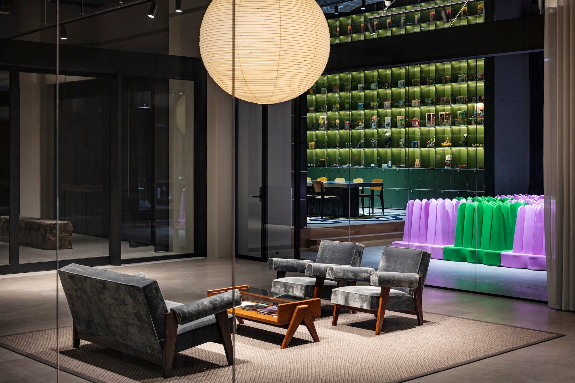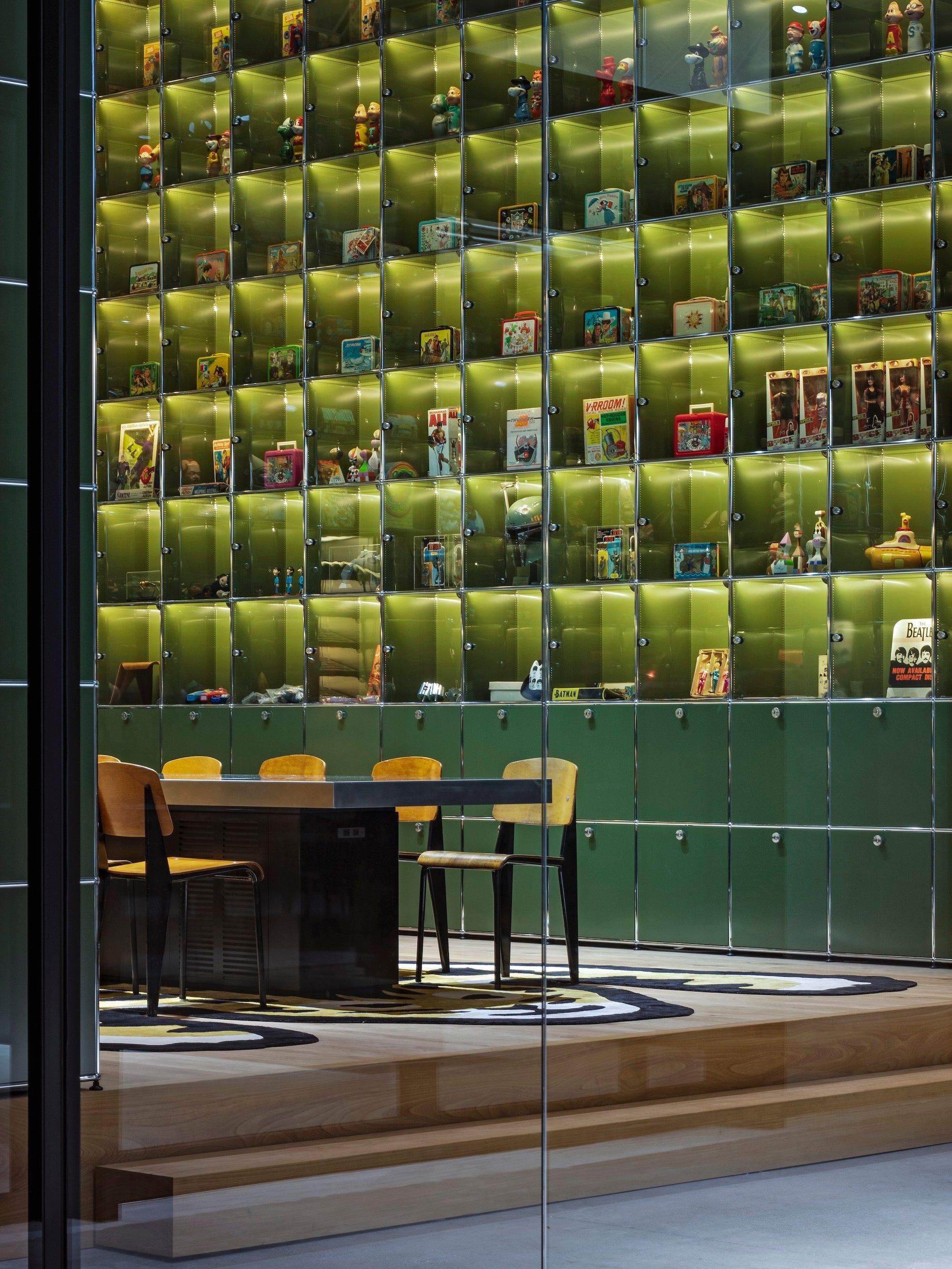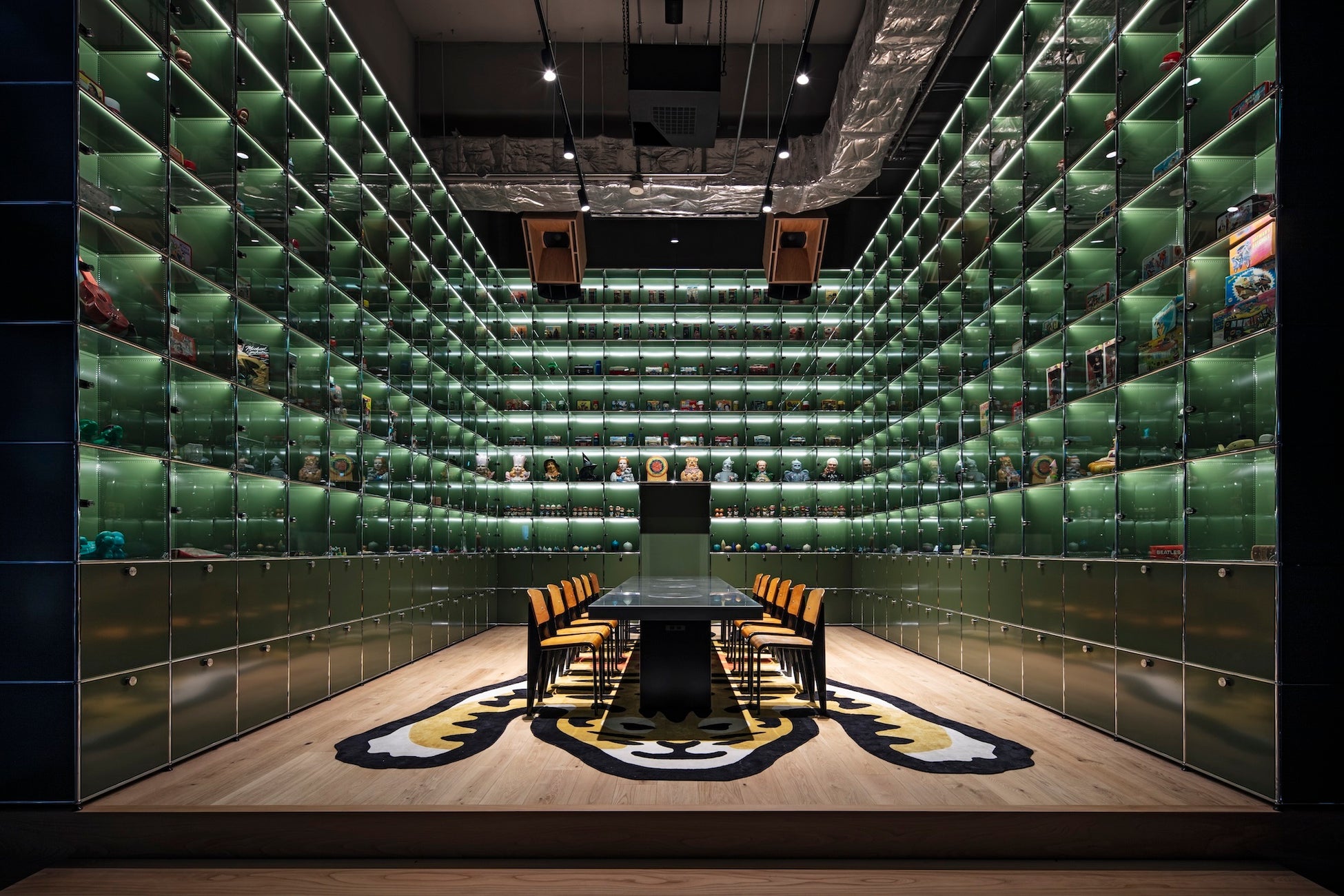 ラウンジには、NIGO®氏が長年愛用するモジュラー家具の定番であるスイスのUSMハラーシステムがコの字に3面、高層に積み上げられ 、284個のユニットで構成された巨大なストレージウォールとなっています。