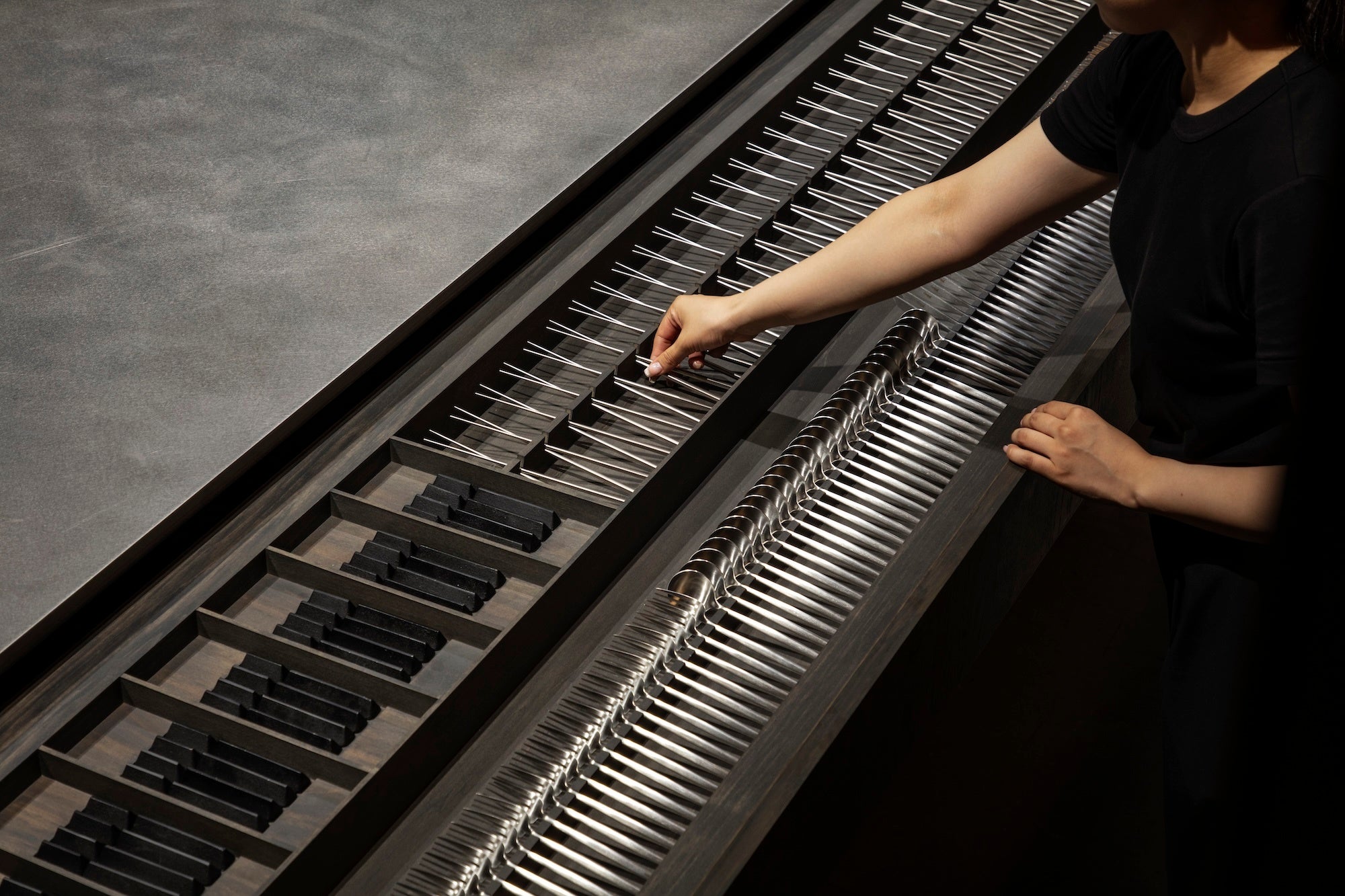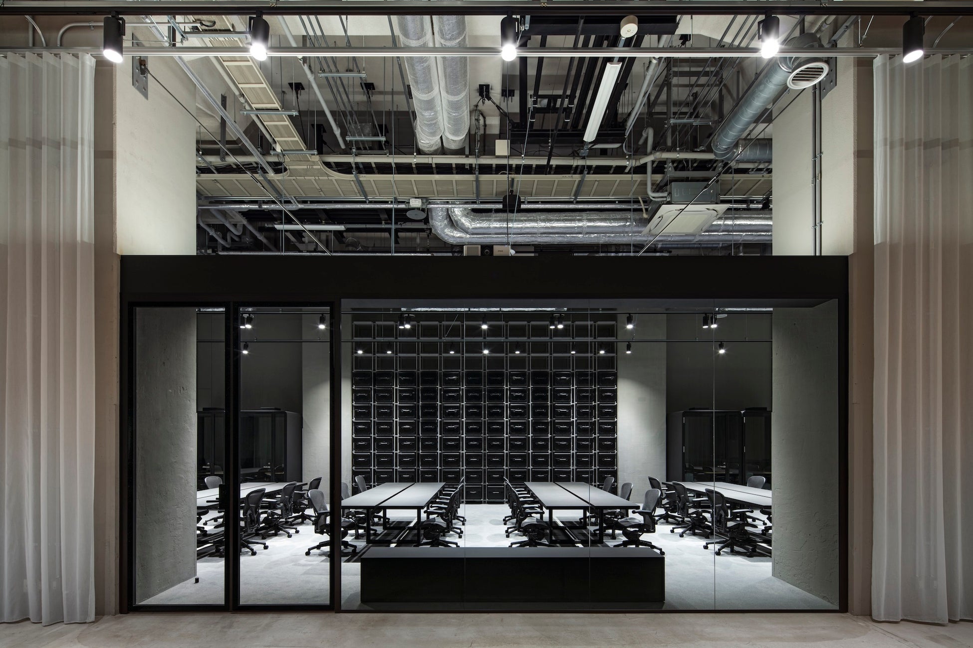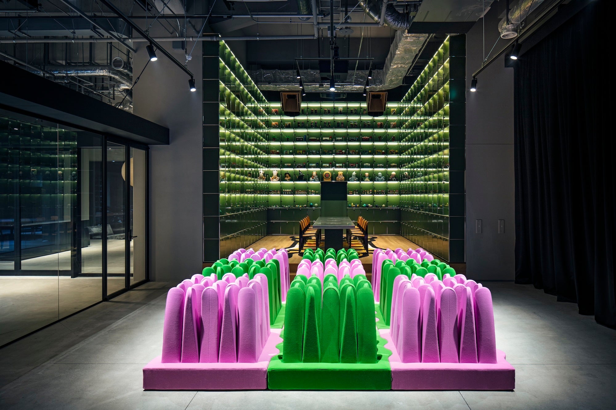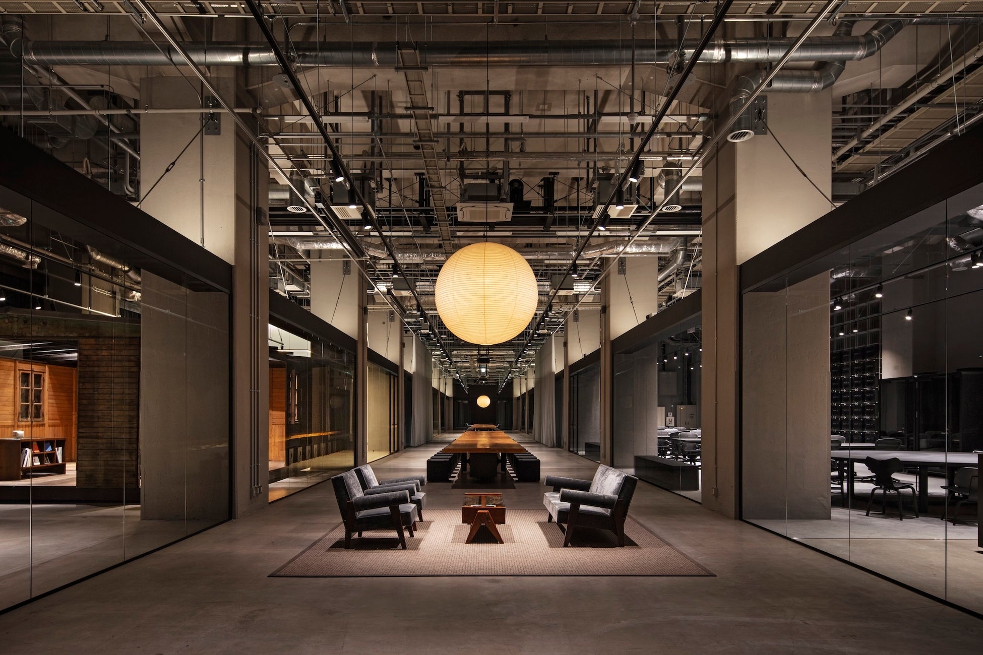 ラウンジには、NIGO®氏が長年愛用するモジュラー家具の定番であるスイスのUSMハラーシステムがコの字に3面、高層に積み上げられ 、284個のユニットで構成された巨大なストレージウォールとなっています。