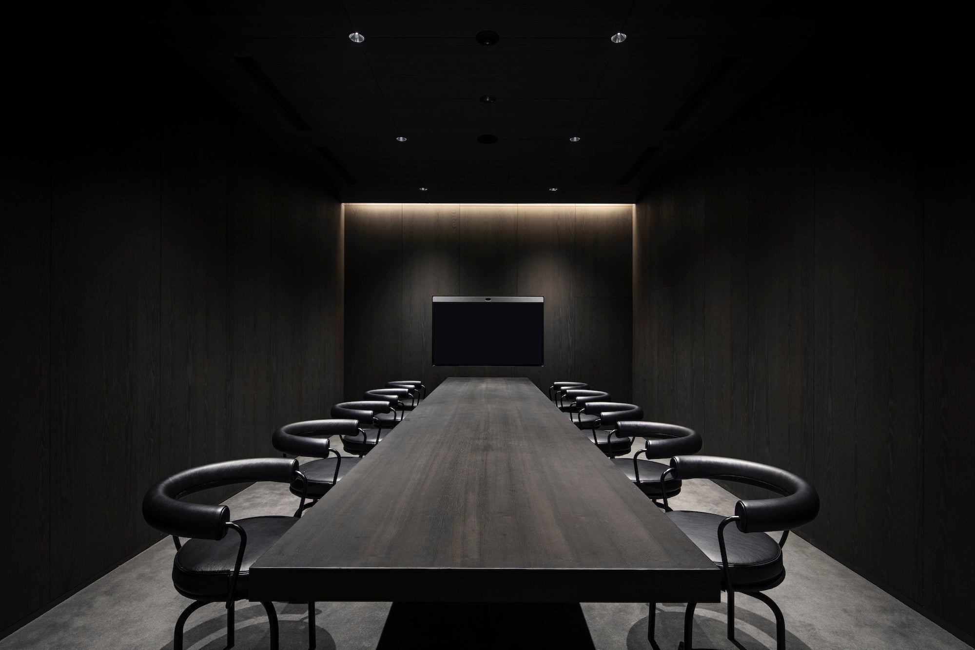 デザインチェアが並ぶミーティングスペースで、NOT A HOTEL各拠点で採用されている家電やカトラリーを備えたキッチンを併設しています。キッチンスペースは濃いグレーを基調とし、大きな丸いテーブルの周囲にデザインの異なる10種類の黒い椅子が配置されています。