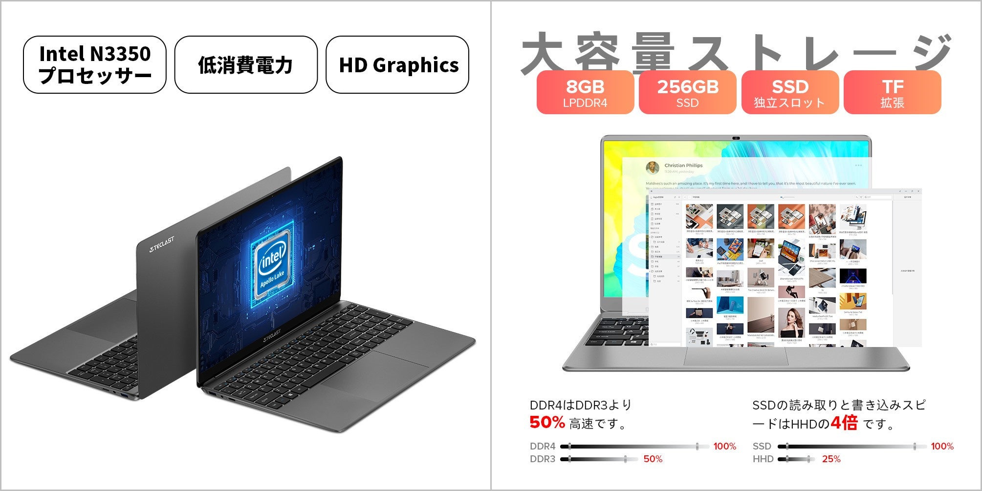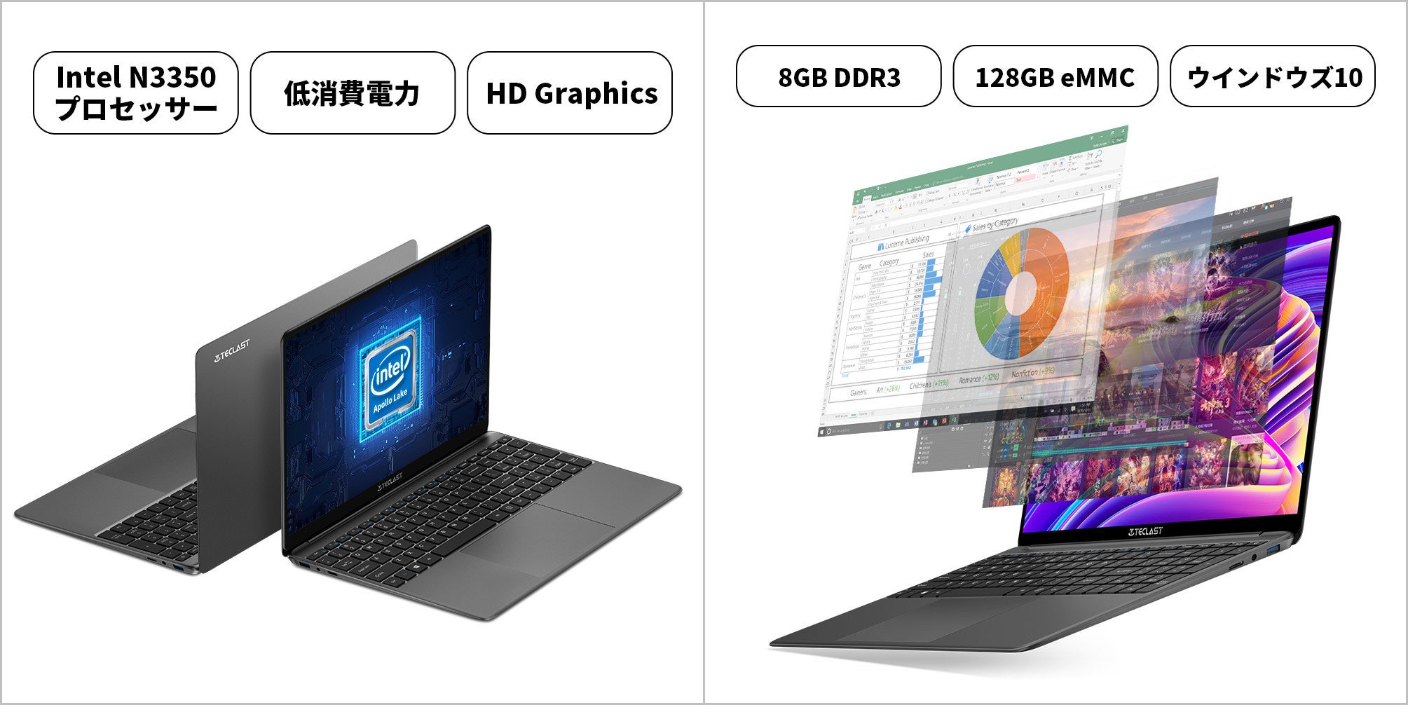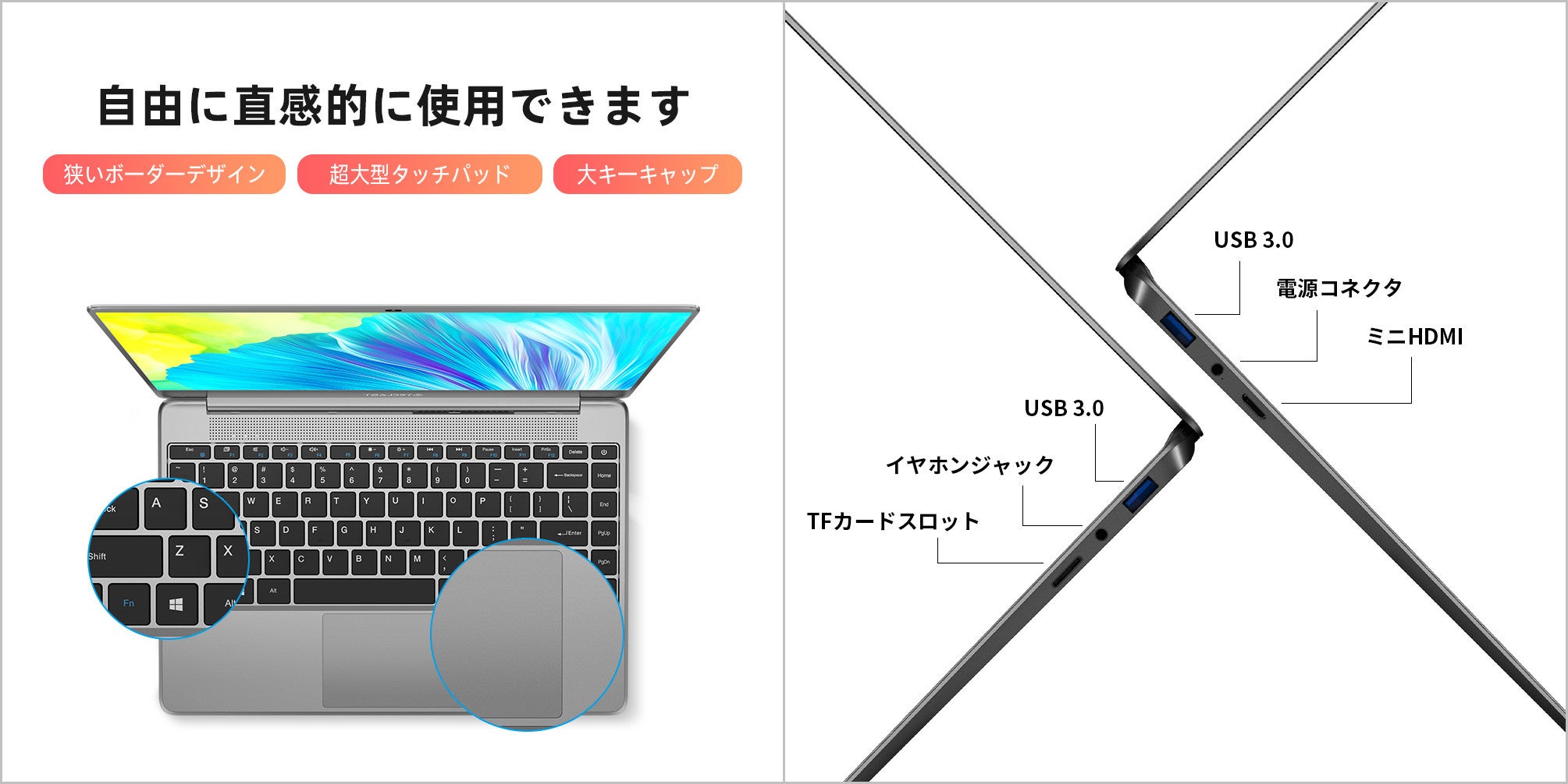 Windows 10 Intel Celeron N3350 8GB+128GB 15.6インチ FHD(1,920×1,080) IEEE802.11 a/b/g/n/ac 、 Bluetooth4.2 USB3.0×2、オーディオジャック、miniHDMI、microSDカードリーダー WEBカメラ 38000mWh 375x243x18mm 1.88kg |