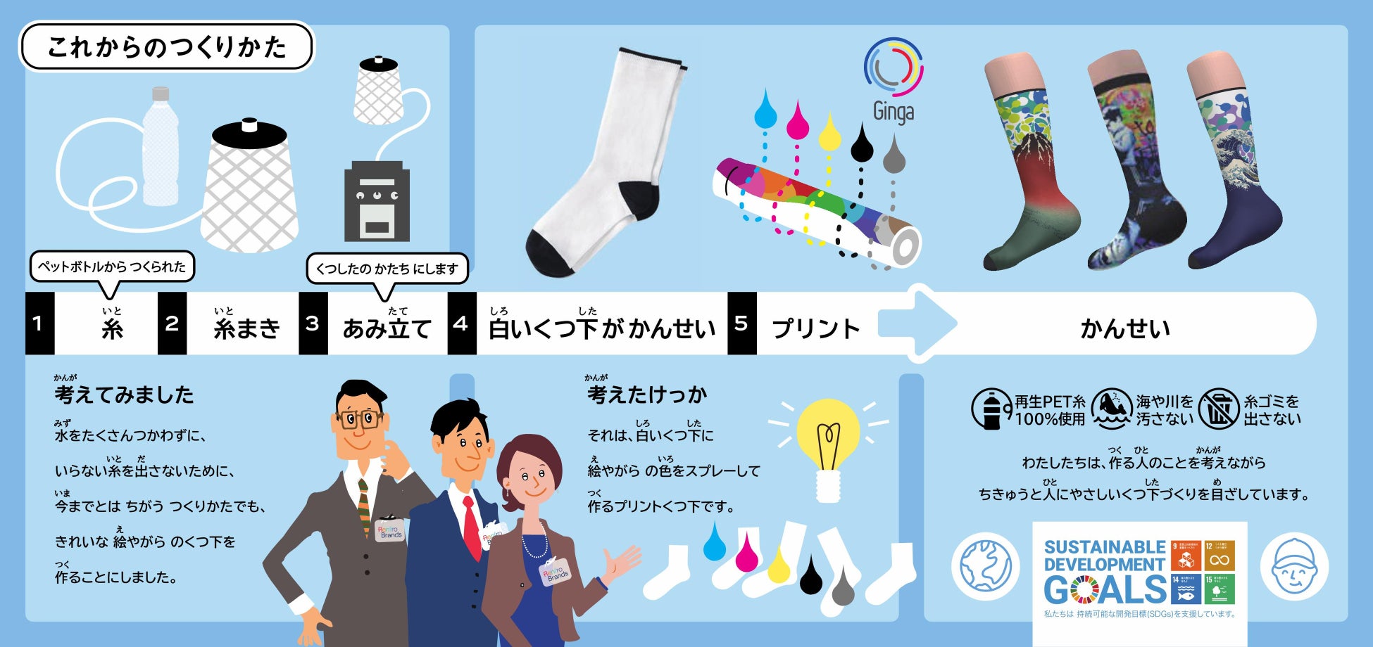 レンフロ・ジャパン株式会社が開発したGINGAは、従来の糸を染めた後編み立て、余分な糸をカットする製法における、染めた糸を洗う工程で河川を汚染すること、カットした糸の廃棄においてCO2を排出することの2点を廃した、環境に優しい靴下専用インクジェットプリント機。GINGAには環境に優しい他、非常に短い納期で極小ロットで生産可能という点でも従来と比較してメリットがあり、今後靴下製造の主流となり得る製法と言われています。