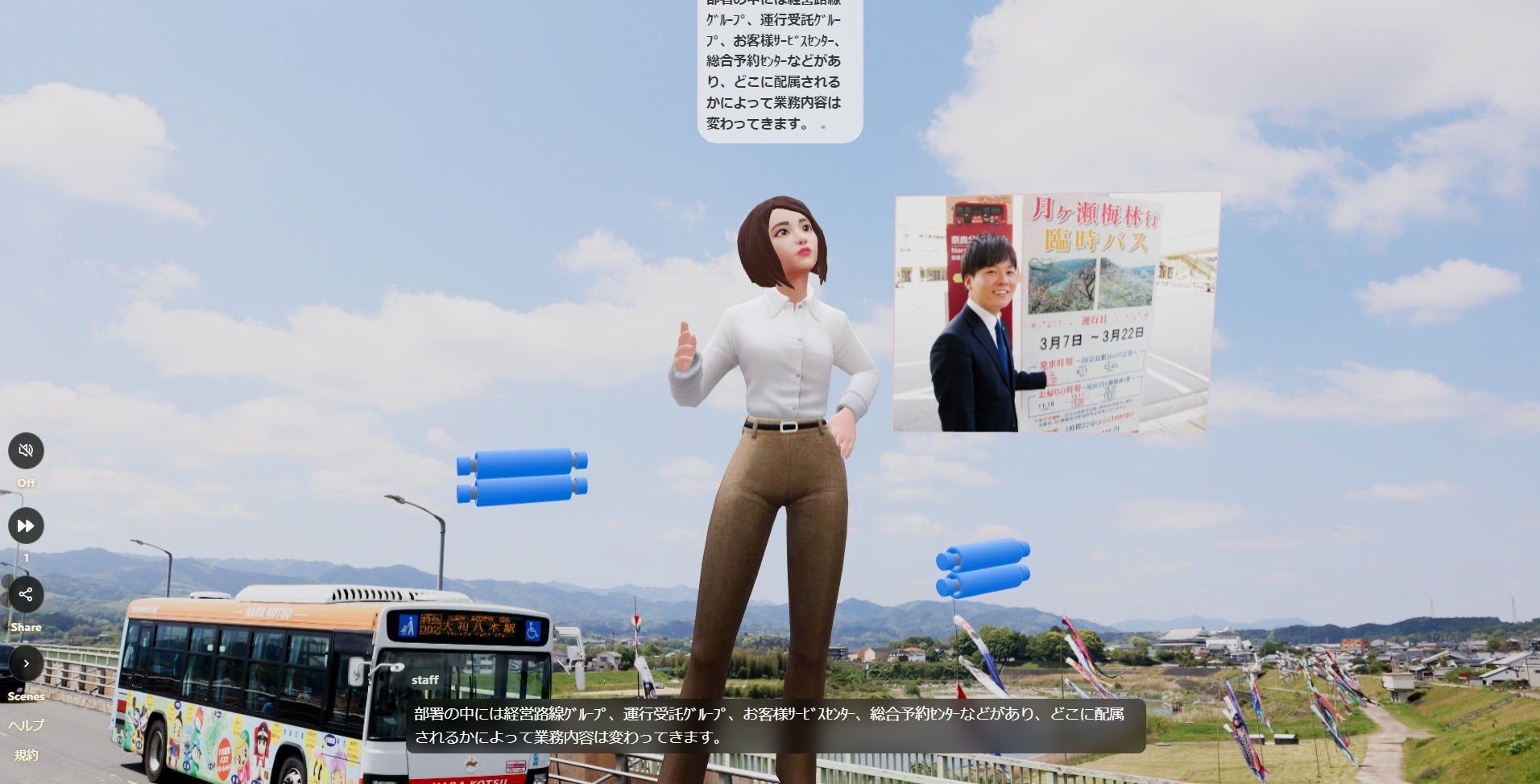 AIアバター広報社員が写真やドキュメントを用いて、関西地域の交通インフラを担う奈良交通株式会社の魅力を伝えます。