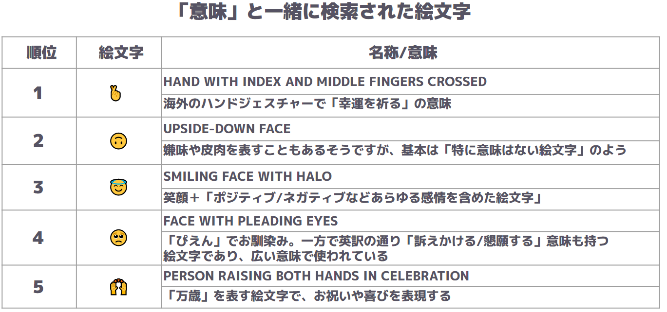 今回の分析では、意味と一緒に検索された絵文字を分析し、多くの人が意味を知りたいであろう絵文字をランキングしました。