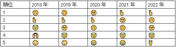 次に、絵文字に年ごとの流行りはあるのか、2018年から2022年までをランキングしました。