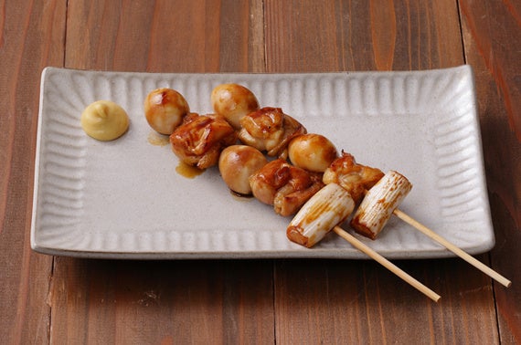 国産うずら卵と鶏もも肉を岩塩で焼き上げました。今回が初登場となる塩焼きは、岩塩を使うことでうずら卵ともも肉の素材のうま味を引き立てています。