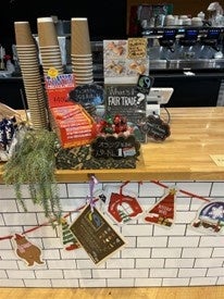 販売コーナーには、オリジナルのPOP「What’s FAIR TRADE?」の説明ボード、フェアトレード・ジャパンの公式リーフレットを設置し、購入時に自然とフェアトレードを学べる場をつくっています。季節の飾り付けや写真映えするディスプレイも好評で、