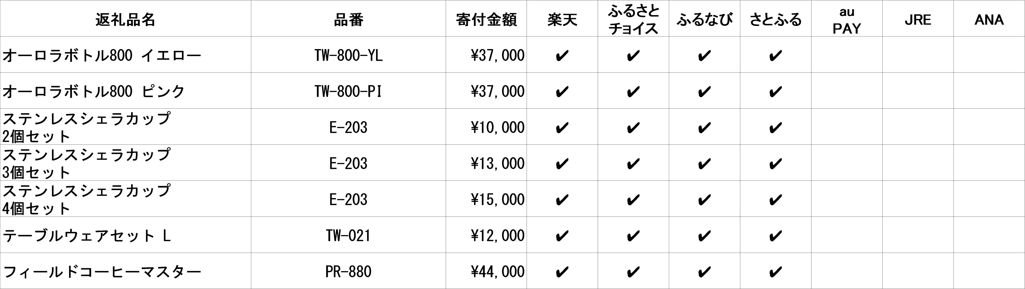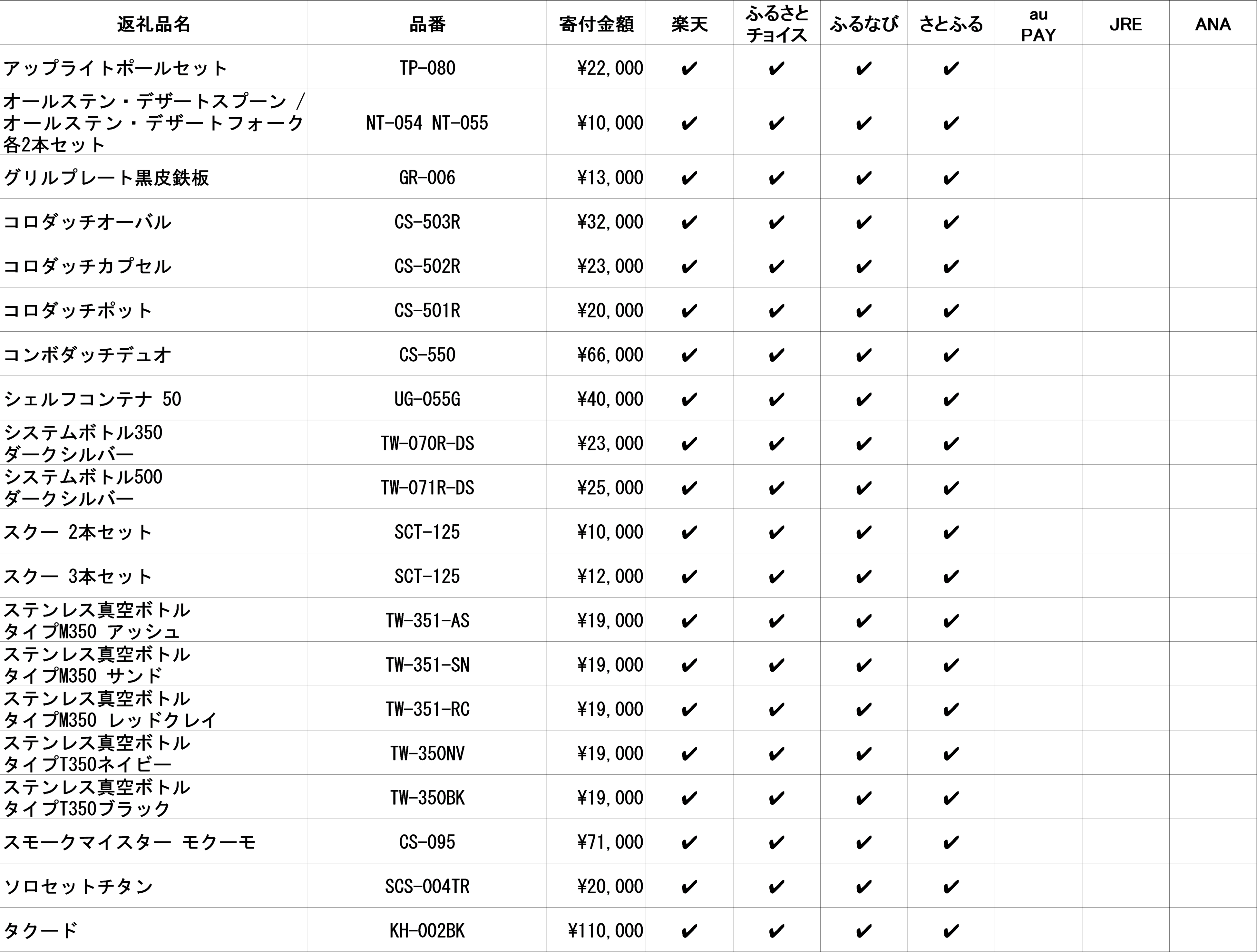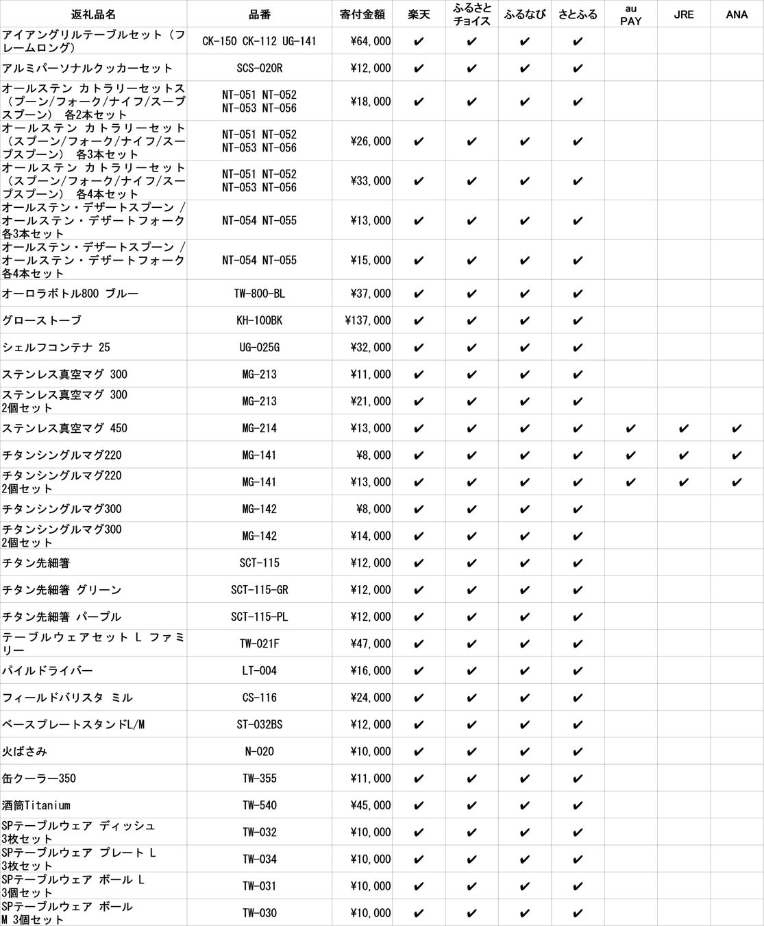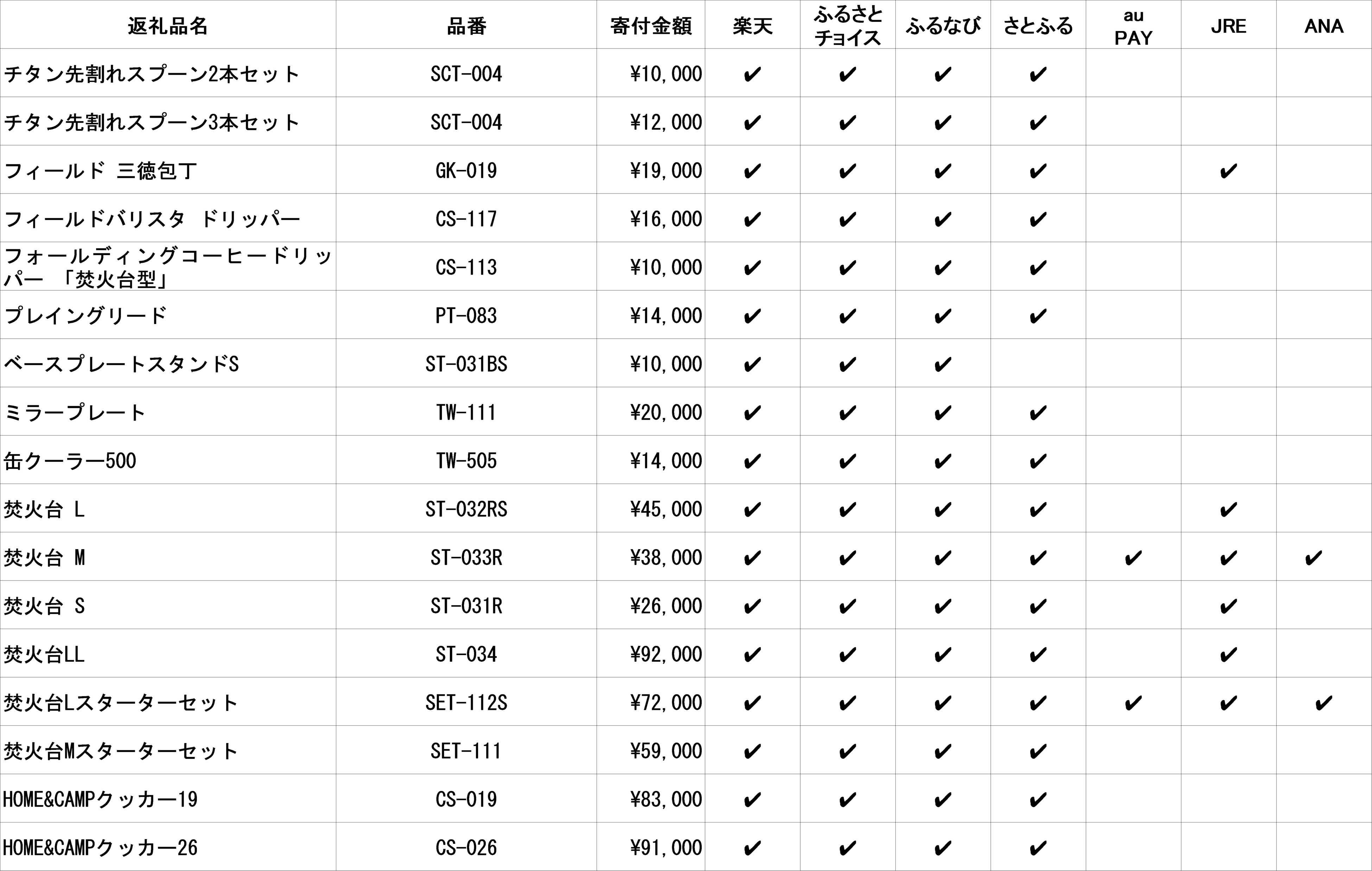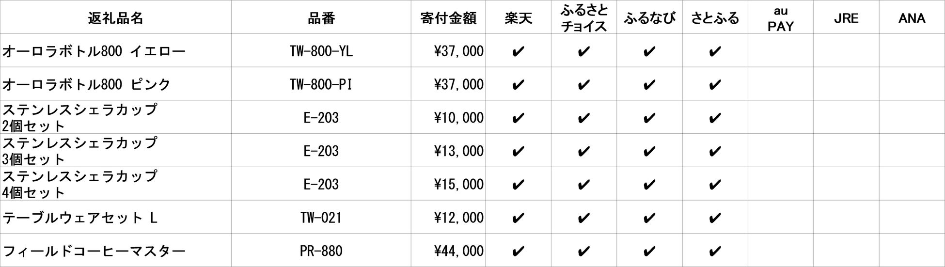 楽天ふるさと納税、ふるさとチョイス、ふるなび、さとふる、JRE MALL ふるさと納税、au PAYふるさと納税、ANAのふるさと納税にて出品の予定です。(別表参照)