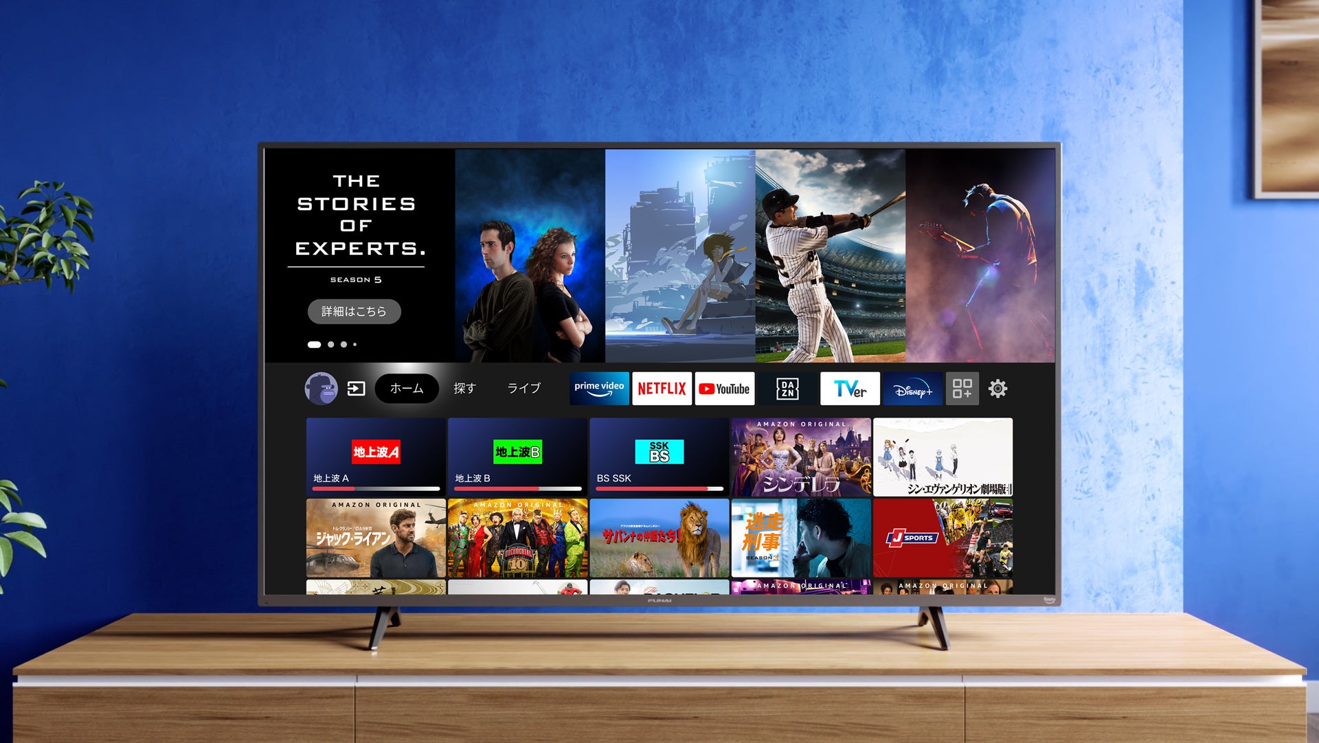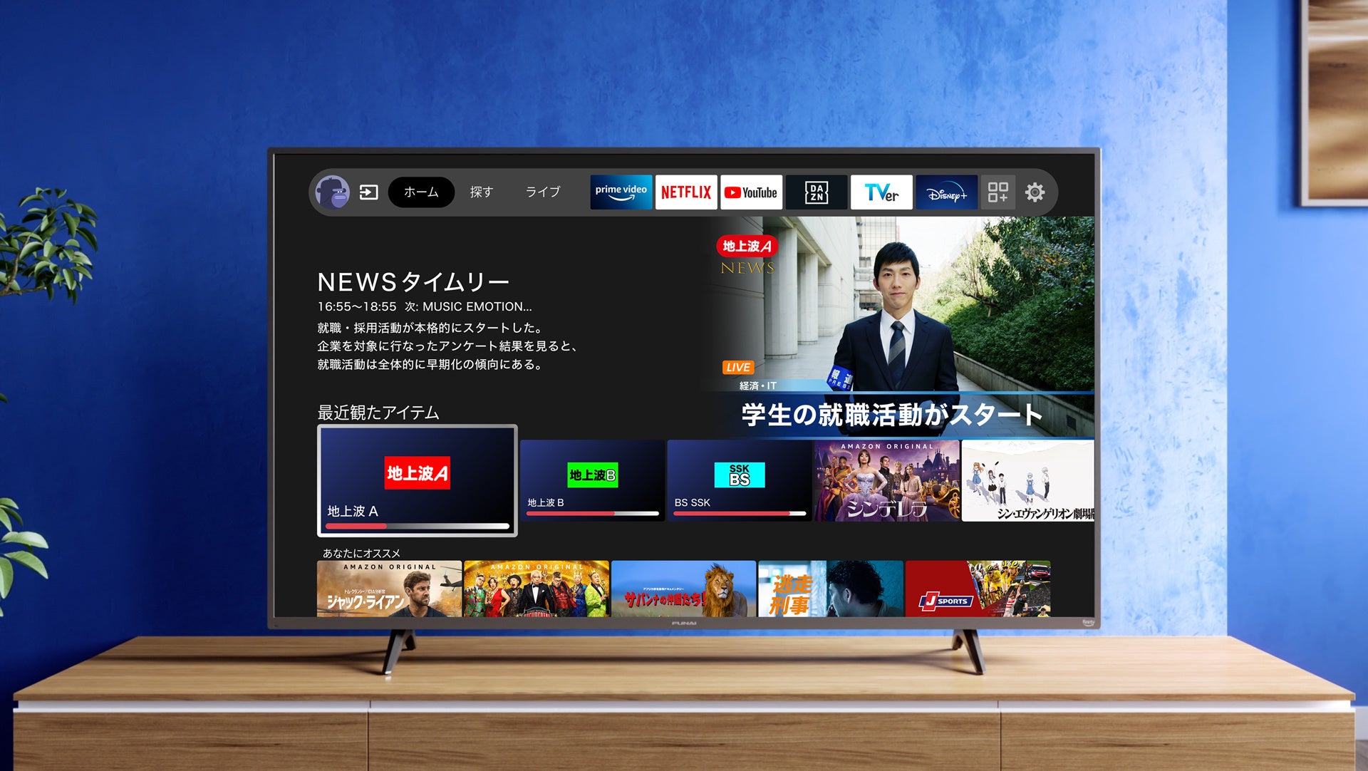 本機では地上波、BS/CS、4Kの各種放送、リアルタイム配信の番組、ニュース、スポーツ中継に加えて、Fire TVの機能を通じてPrime Video、YouTube、Netflix、Hulu、TVer、ディズニープラス、ABEMA、DAZNなど、豊富なストリーミングサービスによる45万以上の映画作品やテレビ番組のエピソードをお楽しみいただけます*2。また別途、外付けハードディスクを用いれば地上波、BS/CS放送、そして4K放送番組を録画して、視聴することも可能です*4。さらにAmazon Musicなどの音楽配信サービスを含む、様々なアプリもご用意しています*2。これらのテレビ放送やストリーミング動画等のコンテンツが同一画面に表示されるので、お客様はシンプルなデザインのリモコンを使って、その時の気分や目的に合わせて、直観的に操作することができます。さらに、ご家族一人一人のプロフィールを最大6名分まで作成することができ、家族それぞれが見ていたコンテンツの続きを簡単に再生したり、チャンネルをお気に入りに登録したり、ウォッチリストに登録することが可能です。また、購入後のご自宅でのセットアップも簡単で、本機を電源ケーブルとアンテナ線につなぎ、画面に表示される指示に従いWi-Fiに接続し、Amazonアカウントを入力すれば視聴の準備が完了します。