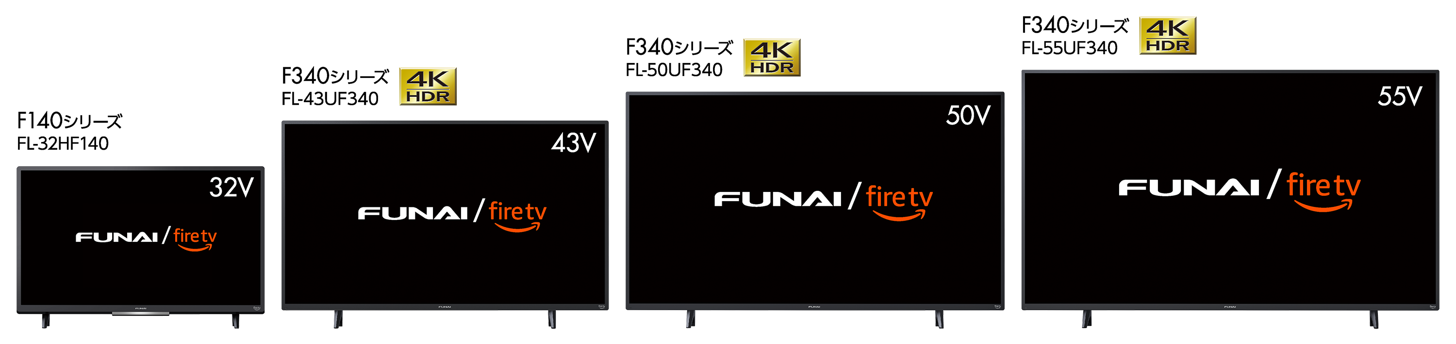 Fire TV搭載スマートテレビは「FUNAI Fire TVスマートテレビ」の商品名で展開され、お客様のニーズに合ったテレビを選択いただけるよう、32インチHD液晶テレビ、43インチ4K液晶テレビ、50インチ4K液晶テレビ、55インチ4K液晶テレビの4つの画面サイズでご提供します。また、これらの機種すべてに各種映像機器や録画用ハードディスクを接続するための端子(HDMI 3ポート、USB 2ポート、Optical 1ポート)、LAN端子や、デュアルバンド、デュアルアンテナ、5GHz対応のWi-Fi機能を備えています。価格は以下の通りです。