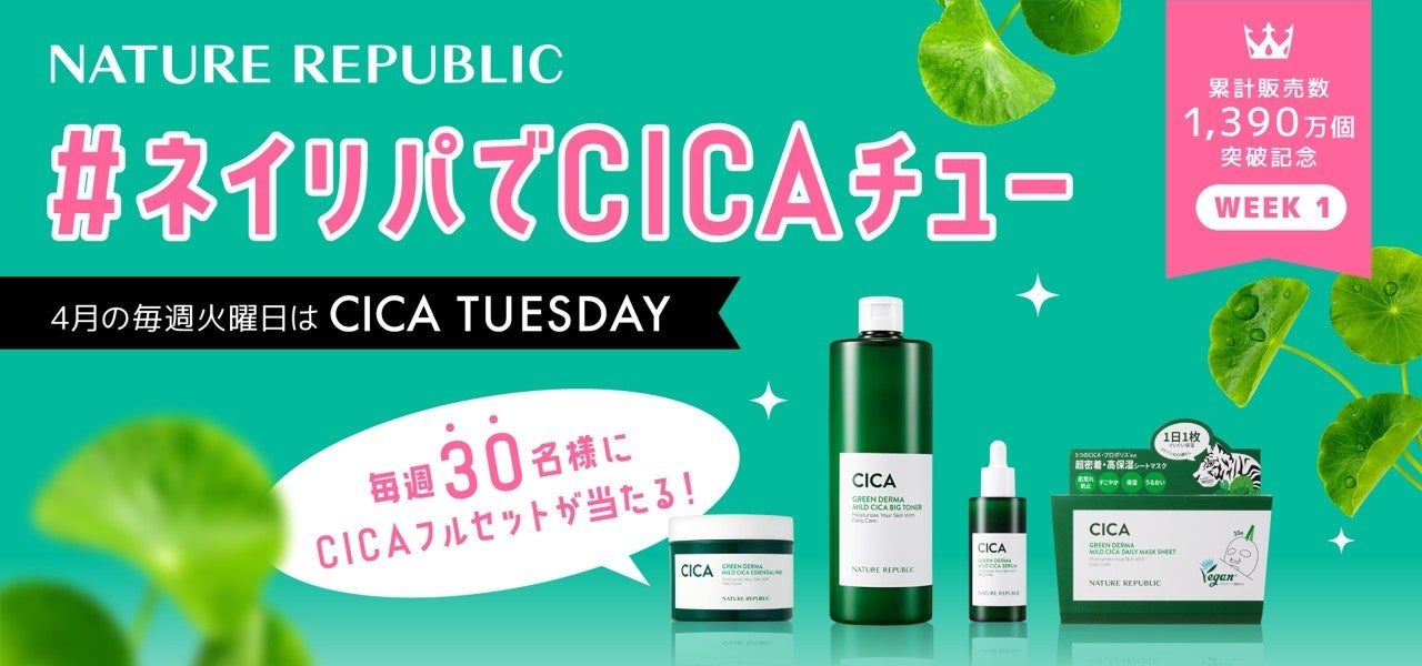 株式会社ネイチャーリパブリックジャパン(所在地:東京都港区浜松町)は、4月の毎週火曜日を「CICA(4・火)の日」に制定いたしました。季節の変わり目を迎える4月。肌のゆらぎを感じる皆さまを肌荒れ防止や保湿ケアができる「グリーンダーマCICA」シリーズでオンラインキャンペーンを通して応援して参ります。