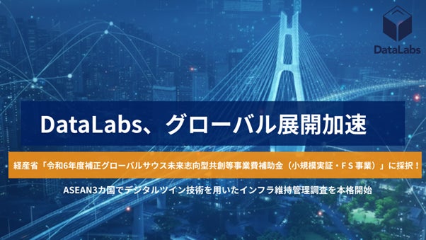 DataLabs株式会社(本社:東京都中央区、代表取締役:田尻大介)は、2026年2月5日、インドネシア共和国・タイ王国・マレーシア/デジタルツイン技術を用いたインフラアセットマネジメント市場調査事業が経済産業省の令和6年度補正グローバルサウス未来志向型共創等事業費補助金(小規模実証・F S事業)に採択されたことをお知らせします。この度、採択された事業は、インドネシア共和国・タイ王国・マレーシアにおける、日本発の高度なデジタルツイン技術によるインフラ維持管理手法の、社会実装に向けた調査を目的としています。