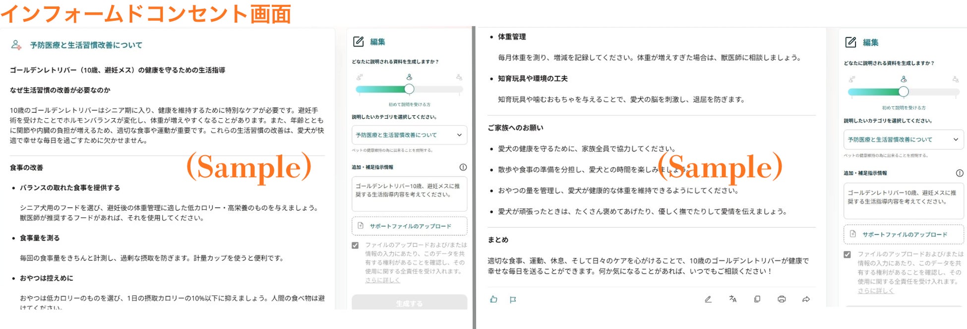 動物病院での説明内容をもとに、飼い主様がご自宅でも家族に説明でき、ホームケアを適切に実践できる説明資料を生成します。