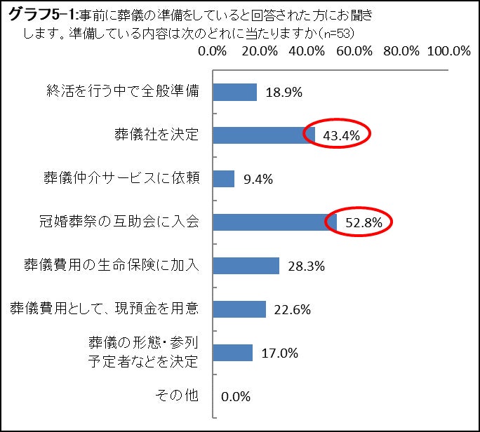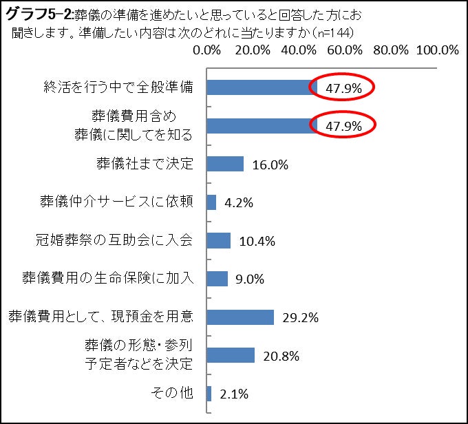 ② 葬儀の事前準備をしている方と今後準備を進めたいと思っている方に準備の内容を聞いたところ、事前準備している方は、グラフ5-1の通り「葬儀社を決定」や「冠婚葬祭の互助会に入会」などかなり具体的な準備が進んでいる一方、今後準備を進めたいと思っている方では、グラフ5-2の通り「終活を行う中で全般準備」や「葬儀費用を含め葬儀に関してを知る」などの情報系の準備に留まっているのがわかる